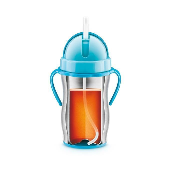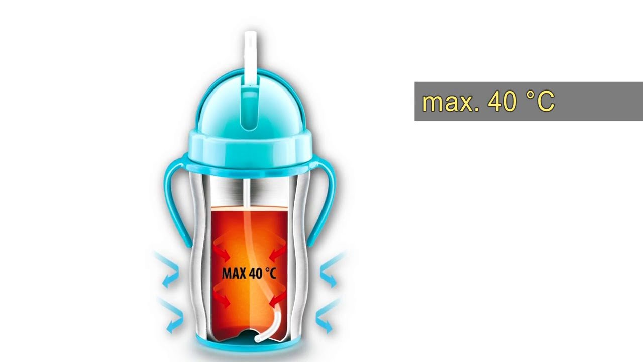Termos dwuwarstwowy, próżniowy wykonany ze stali nierdzewnej utrzymuje temperaturę ciepłych i zimnych napojów. Posiada elastyczną, silikonową słomką, która sięga samego dna. Butelka jest praktyczna i poręczna. Posiada podwójne, zdejmowane uchwyty, dzięki czemu łatwiej go trzymać lub zawiesić. Łatwy sposób otwierania sprawia, że dziecko bez trudu poradzi sobie, gdy zachce mu się pić, a zamykając wieczko automatycznie schowa słomkę.