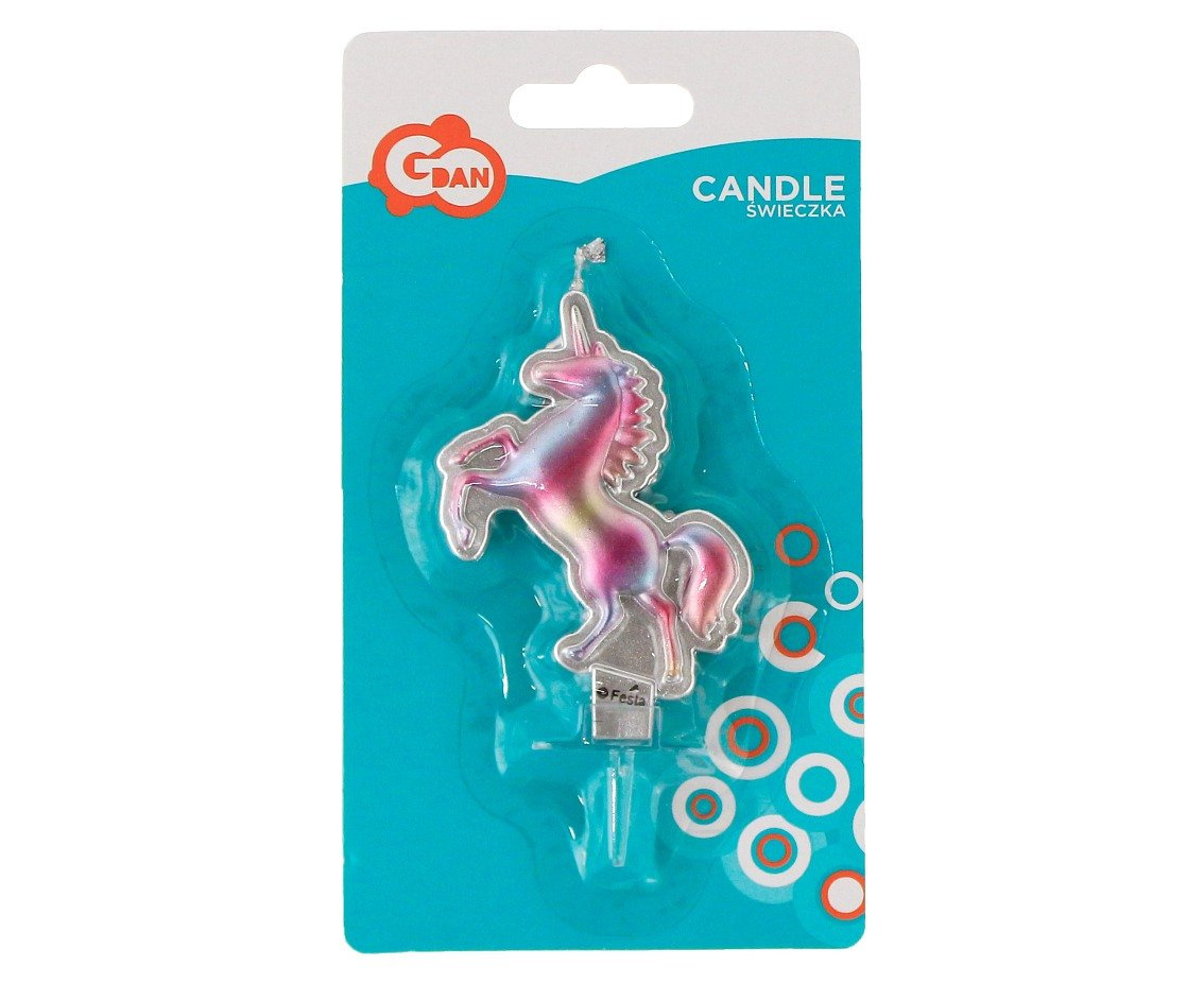 - Elegancka świeczka na super okazje. Dodatek, który zachwyci każde dziecko. Mają kształt tęczowego jednorożca na srebrnym, połyskującym tle. Świeczka umieszczona jest na plastikowym, przeźroczystym stojaku.