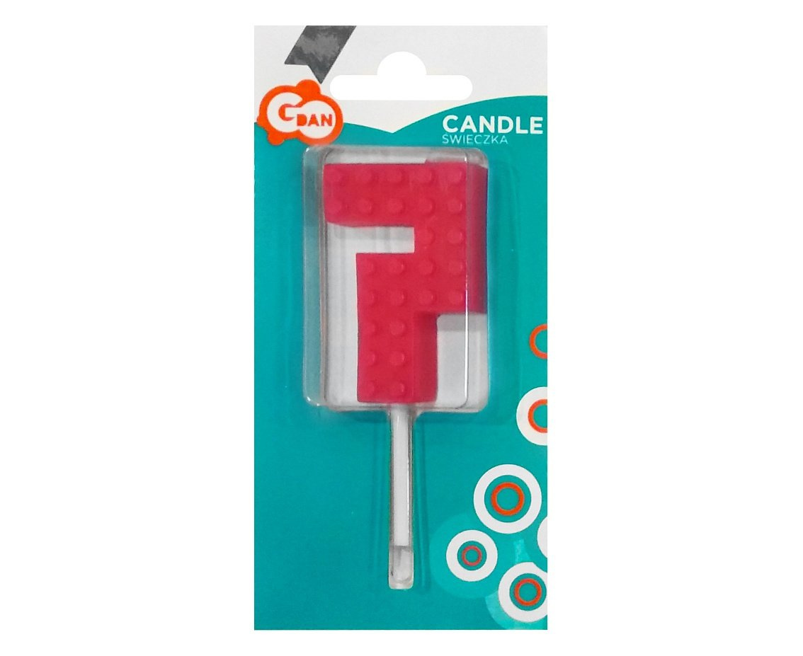 - Kolorowa świeczka z w kształcie cyferki 7. Świeczka stylizowana jest na styl popularnych klocków. Mocowana na torcie urodzinowym na wykałaczce. Skompletowana z innymi cyframi tworzy dowolny numer.