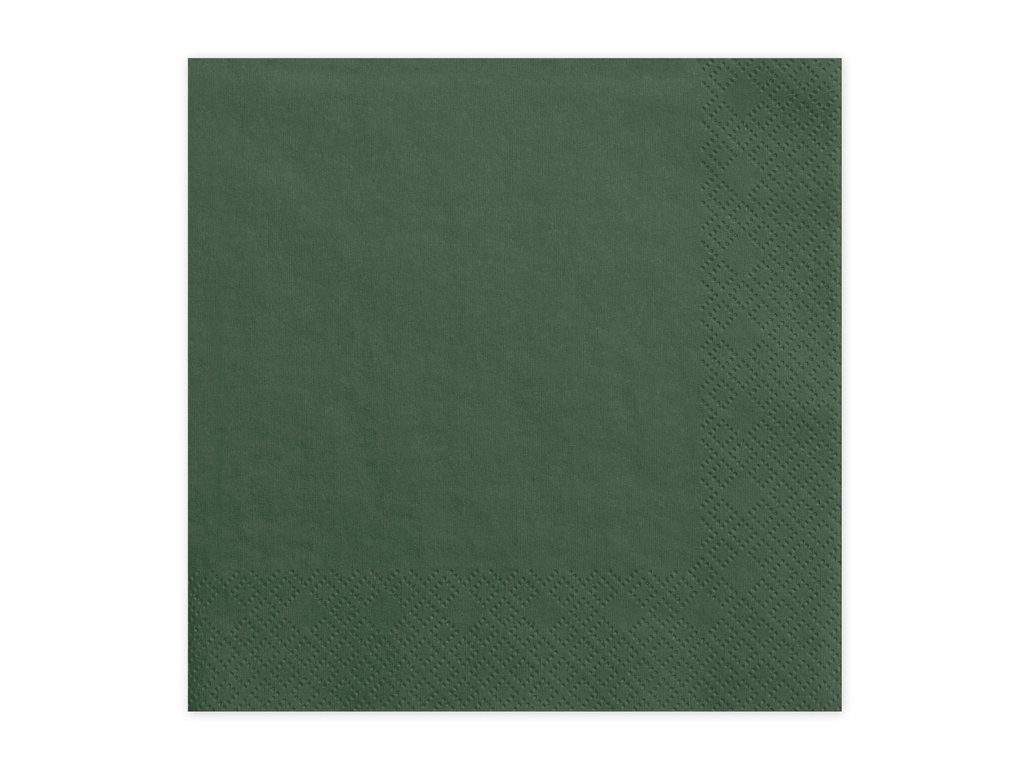 Serwetki w zielonym kolorze, w odcieniu butelkowej zieleni. Chusteczki mają rozmiar: 33cm x 33cm i są 3-warstwowe. Serwetki stanowią piękne dopełnienie dekoracji stołu na urodzinach, imieninach czy letniego przyjęcia w ogrodzie. Znakomicie sprawdzą się w stylizacji pomieszczenia z okazji Bożego Narodzenia, Wielkanocy, a także dla fanów piłki nożnej.