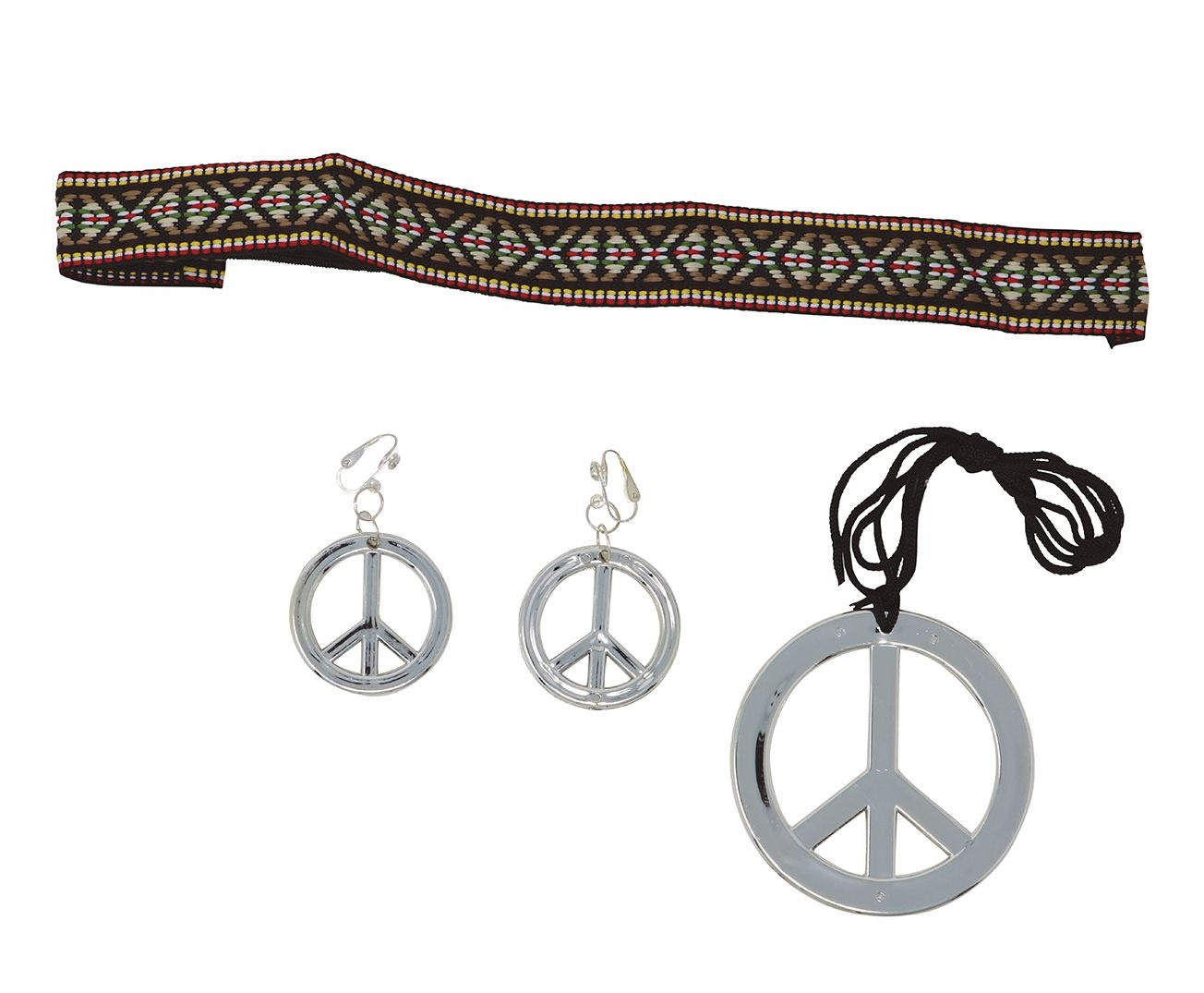 - Idealny dodatek do przebrania hipiski z lat 70-tych. Super dla kobiety w stylu dzieci kwiaty. Zestaw zawiera: opaskę na głowę, wisiorek ze srebrną pacyfką oraz klipsy w kształcie pacyfek. Nie zawiera peruki.