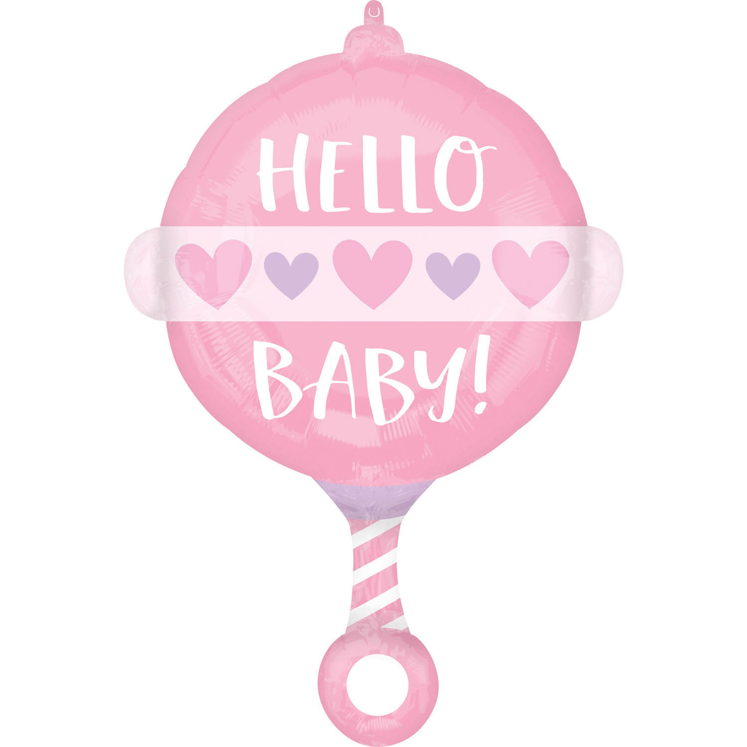 Foliowy balon w kształcie dziecięcej grzechotki. Na balonie widnieje napis: Hello Baby. Zabawka jest w różowym kolorze, dodatkowo ozdobiona serduszkami. Znakomita dekoracja na Baby Shower oraz imprezę z okazji narodzin dziewczynki.