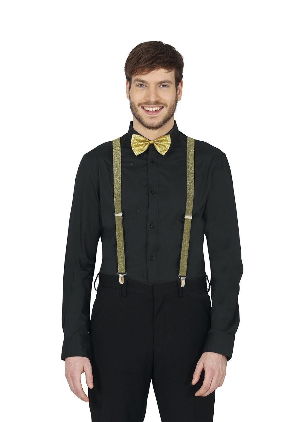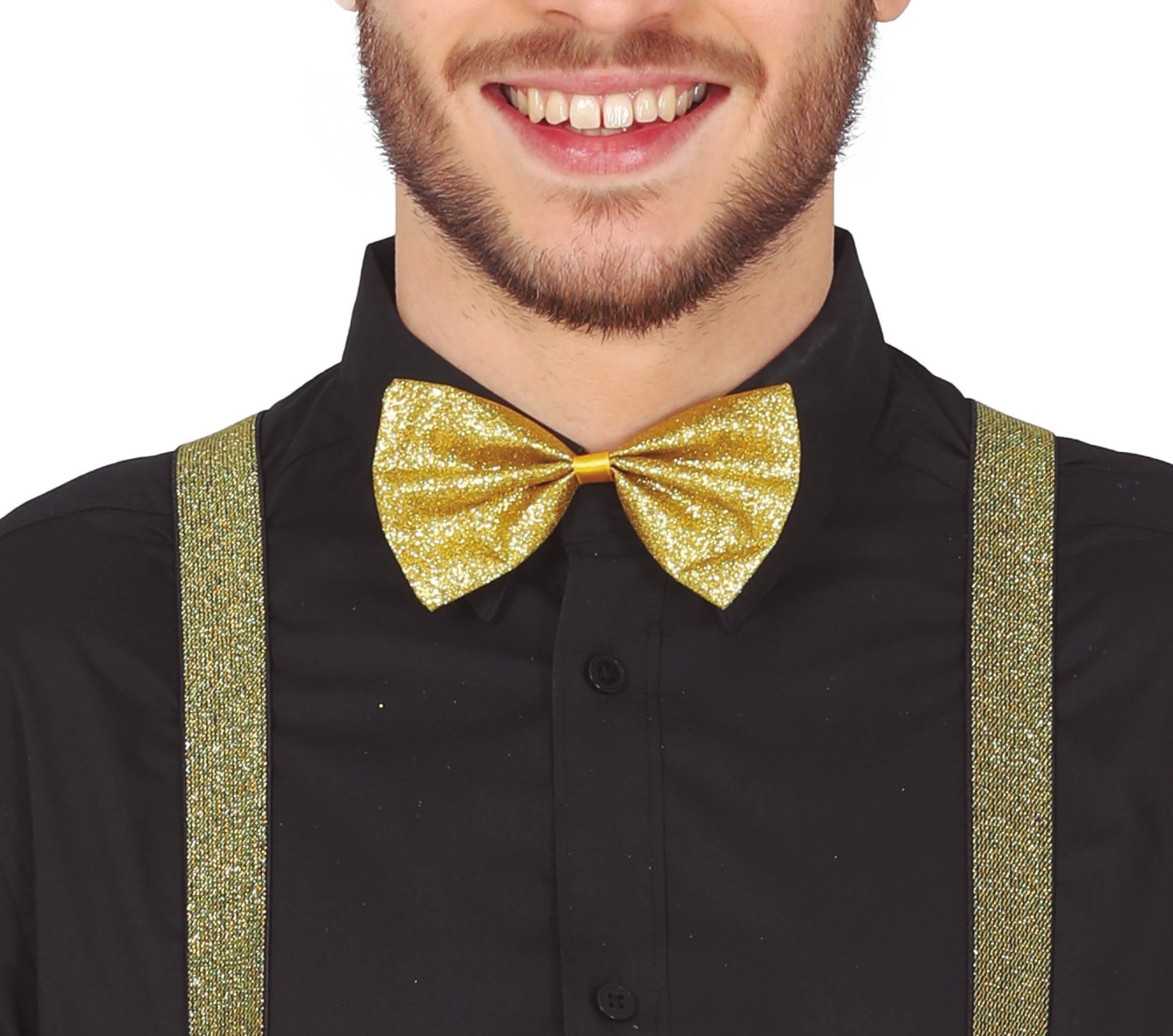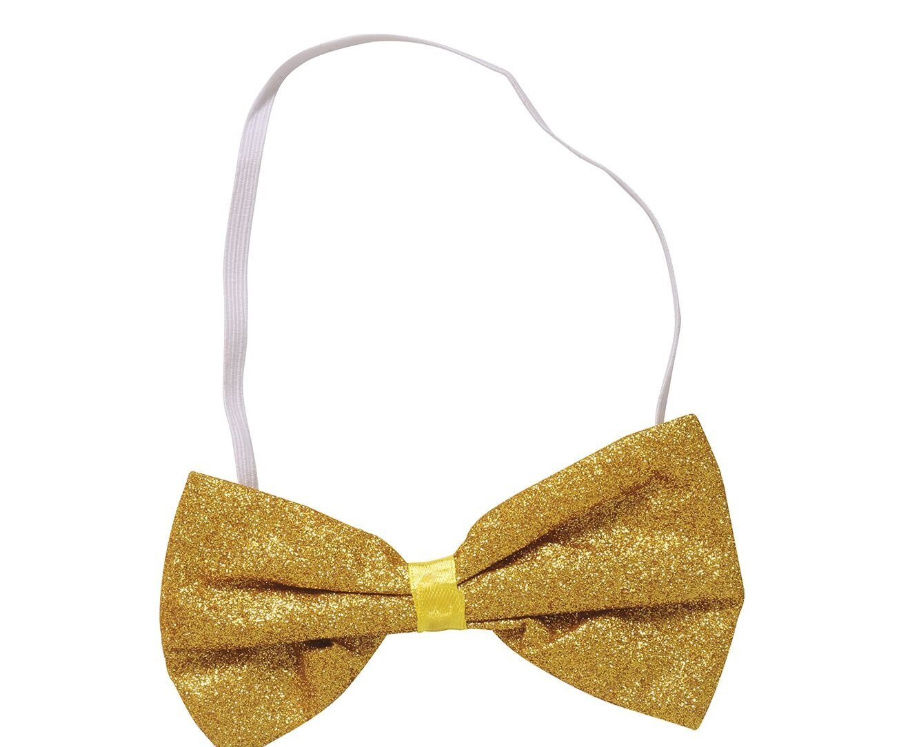 Mucha wykonana ze złotej, połyskującej nici - obustronnie taka sama. Muszka mocowana na białej gumce. Super dodatek do męskiego lub damskiego stroju na karnawał i inne szalone okazje z błyskiem.