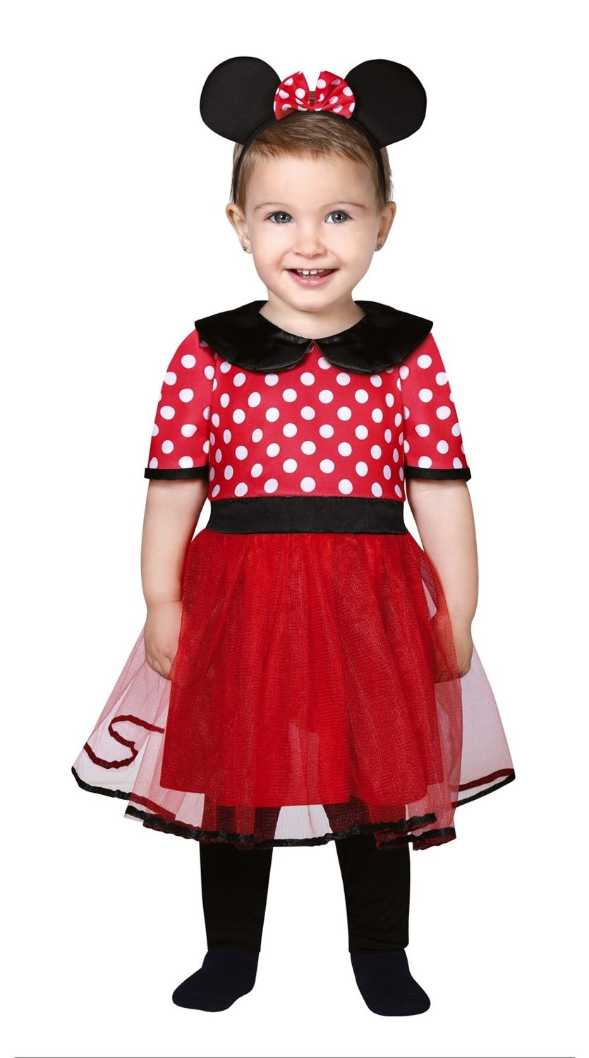 Sukienka bajkowej myszki w czerwonym kolorze. Góra z krótkim rękawkiem w białe groszki, dekolt zdobi czarny kołnierzyk. W pasie wszyta z przodu czarna wstążka, z tyłu gumka, dla lepszego dopasowania. Spódnica dwuwarstwowa; halka z czerwonego materiału, wierzchnia warstwa to czerwony tiul, wykończony czarną satynową wstążką. Sukienka posiada zapięcie na rzep. Przebranie uzupełnia opaska na głowę, obszyta czarnym materiałem z doszytymi okrągłymi uszami myszki. Między uszami znajduje się dekoracyjna czerwona kokardka w białe groszki.