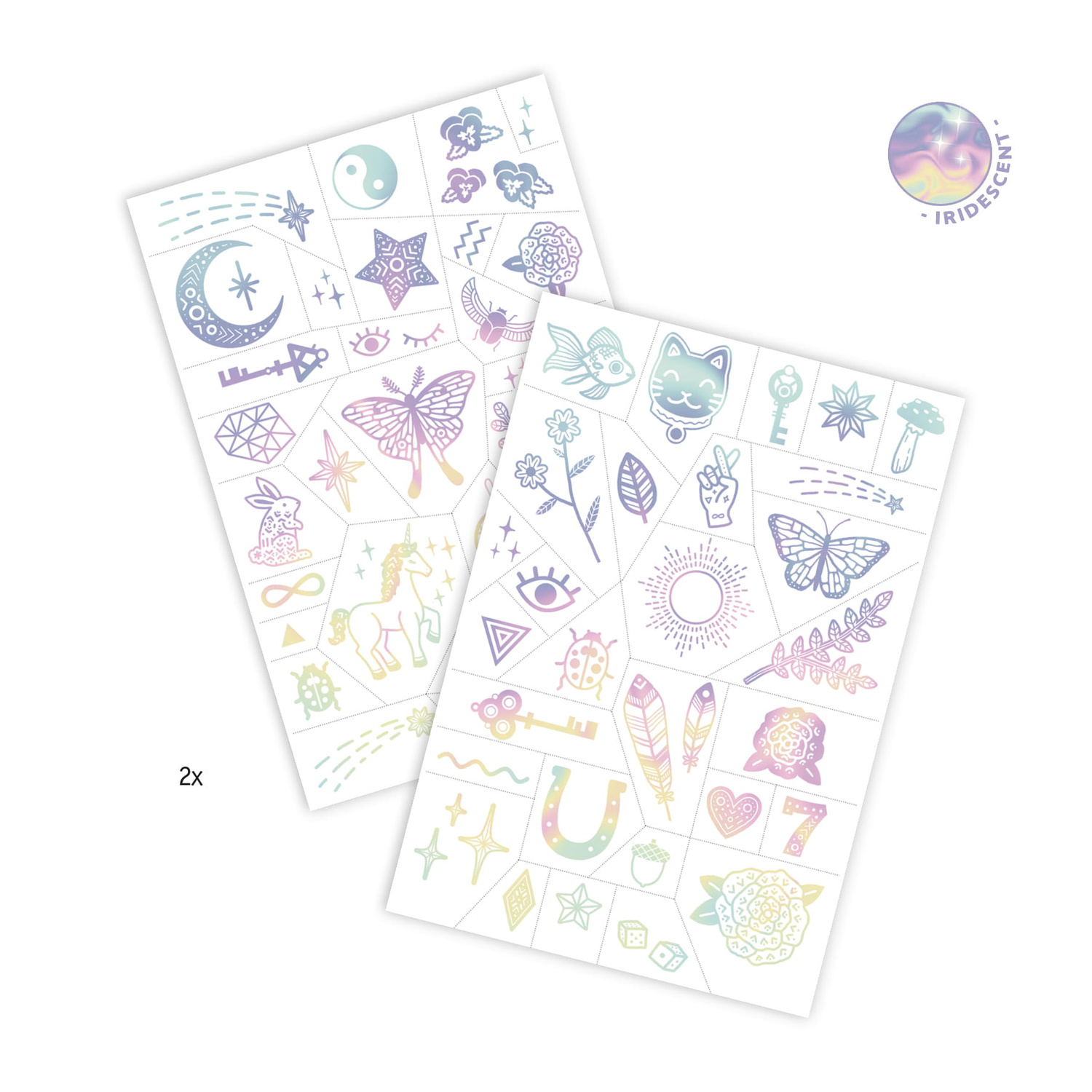 Zestaw tatuaży w srebrno - opalizowanym kolorze, które prezentują talizmany jak: łapacz snów, klucz, jednorożec, kotek szczęścia, podkowa, kości, piórka, złota rybka itp.. Tatuaże pięknie połyskują pod wpływem światła, odbijając różne odcienie barw. Opakowanie zawiera 2 arkusze z różnymi obrazkami.