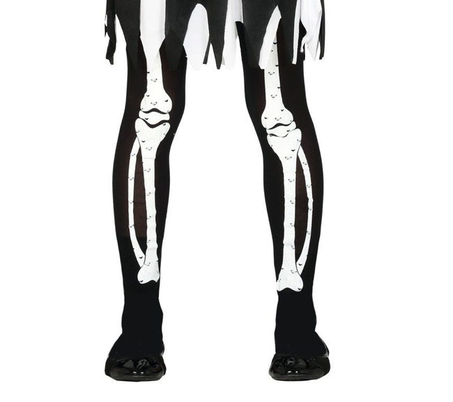 Rajstopy dziecięce czarne pół-kryjące. Z przodu posiadają nadruk białych kości. Nadruk na udzie i piszczeli, jednostronny, tył rajstop gładki.