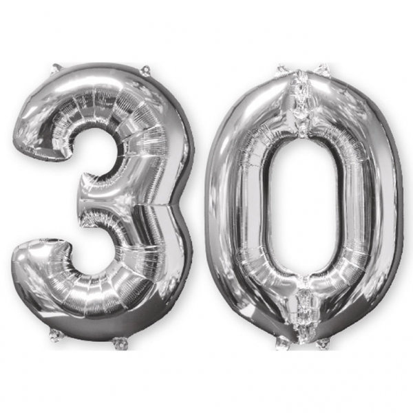 Zestaw dwóch srebrnych balonów foliowych w kształcie cyfry 3 i 0. Balony posiadają zawory samo zamykające, dzięki którym powietrze i hel nie uciekają oraz otworki dzięki którym można przywiązać je np. do ściany czy futryny.