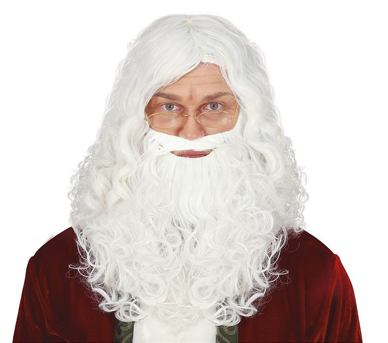 Uzupełnienie charakteryzacji przebrania Świętego Mikołaja lub Dziadka Mroza. W komplecie peruka oraz broda w śnieżnobiałym kolorze. Charakteryzacja wykonana ze sztucznych, długich falowanych włosów.