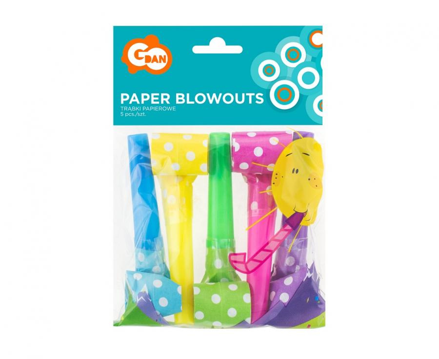 Trąbki rozwijane w urocze białe groszki. Trąbki wykonane są z plastikowego gwizdka i papierowej tulejki. Każdy gwizdek jest w kolorze papierowej części. W opakowaniu znajduje się 5 dmuchawek w kolorze: różowy, fioletowy, żółty, niebieski, zielony. Piszczałki sprawdzą się na każdym przyjęciu, aby radośnie zadąć na cześć solenizanta lub jubilata.
