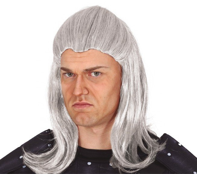 - Szara peruka bez grzywki z prostymi włosami. Włosy od góry są związane w kitkę, a reszta pozostawiona luzem. Peruka będzie idealna do kostiumu wojownika, Wiedźmina, leśnego elfa, starszego hippisa czy innego długowłosego mężczyzny.