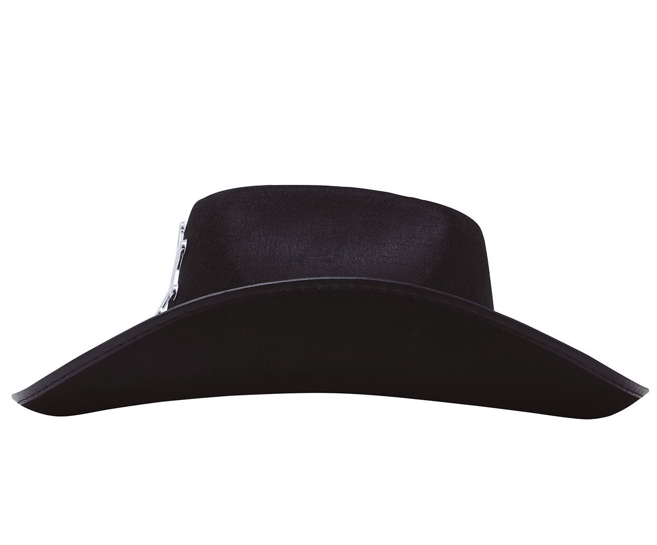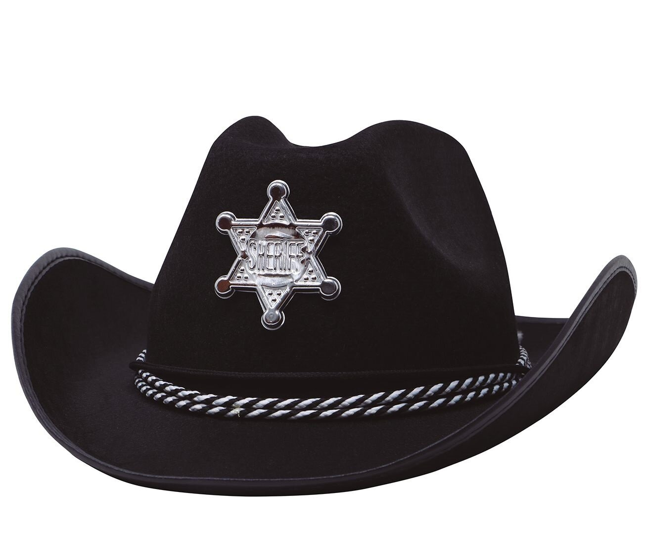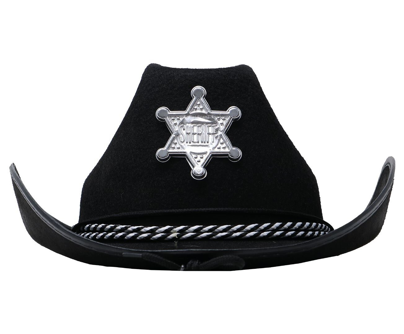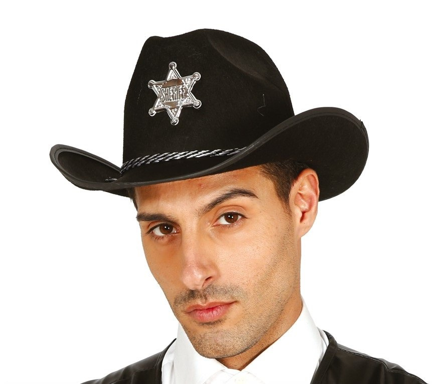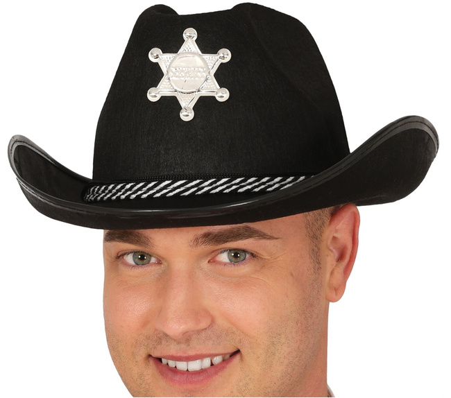 Czarny kapelusz kowbojski z gwiazdą. Kapelusz jest sztywny, obszyty czarną lamówką. Na przodzie przymocowana jest srebrna, plastikowa odznaka z napisem DEPUTY SHERIFF. Kapelusz opasany jest biało-czarnym sznurem. Dodatkowo posiada czarny sznurek ze ściągaczem.