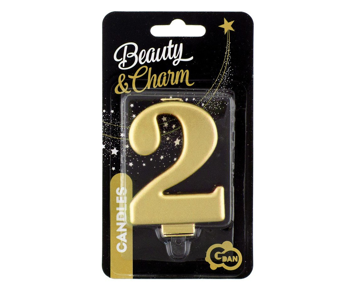 Świeczka w kształcie cyfry 2 pokryta jest metalizowaną farbą w eleganckim, złotym kolorze. Świeczka mocowana na torcie urodzinowym lub rocznicowym na przymocowanej, plastikowej podstawce. Skompletowana z innymi cyframi tworzy dowolny numer.