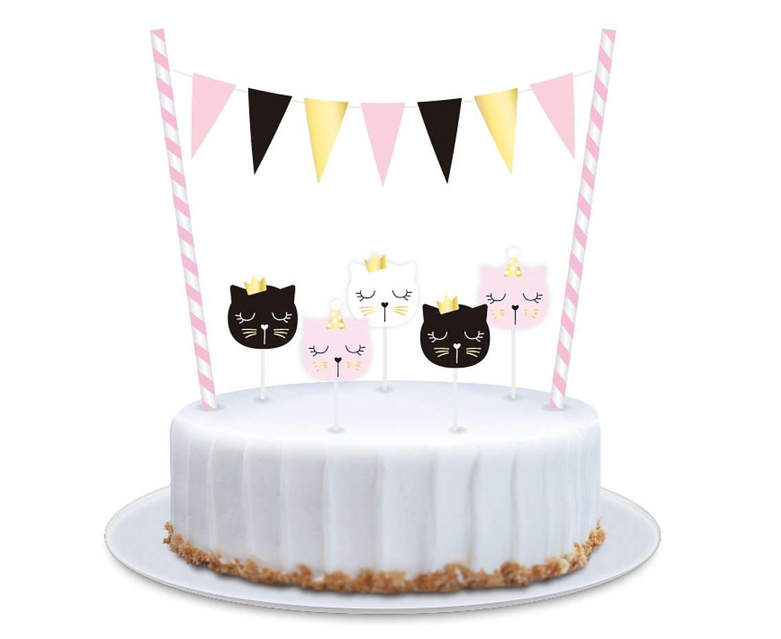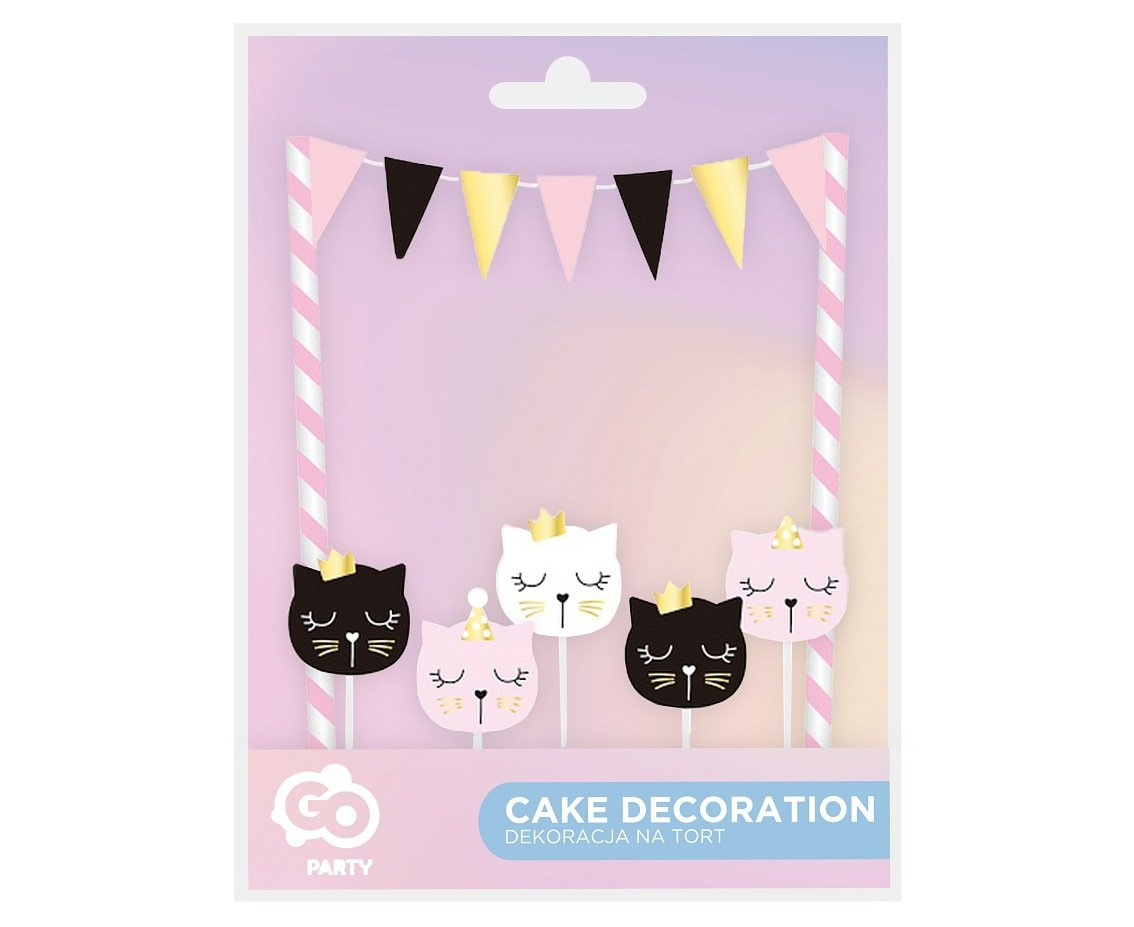 Świeczki w kształcie głów kotów z imprezowymi czapeczkami lub koronami. Świeczuszki są w różowym, czarnym i białym kolorze, posiadają jednostronny nadruk buzi. Mocowane na plastikowych pikerach. Komplet wzbogaca ją dwie papierowe słomki w biało - różowym kolorze. Do rurek przyczepiony jest biały sznurek - girlanda z tekturowymi, trójkątnymi flagami. Nadruk jednostronny. Baner mocowany na drewnianych wykałaczkach.