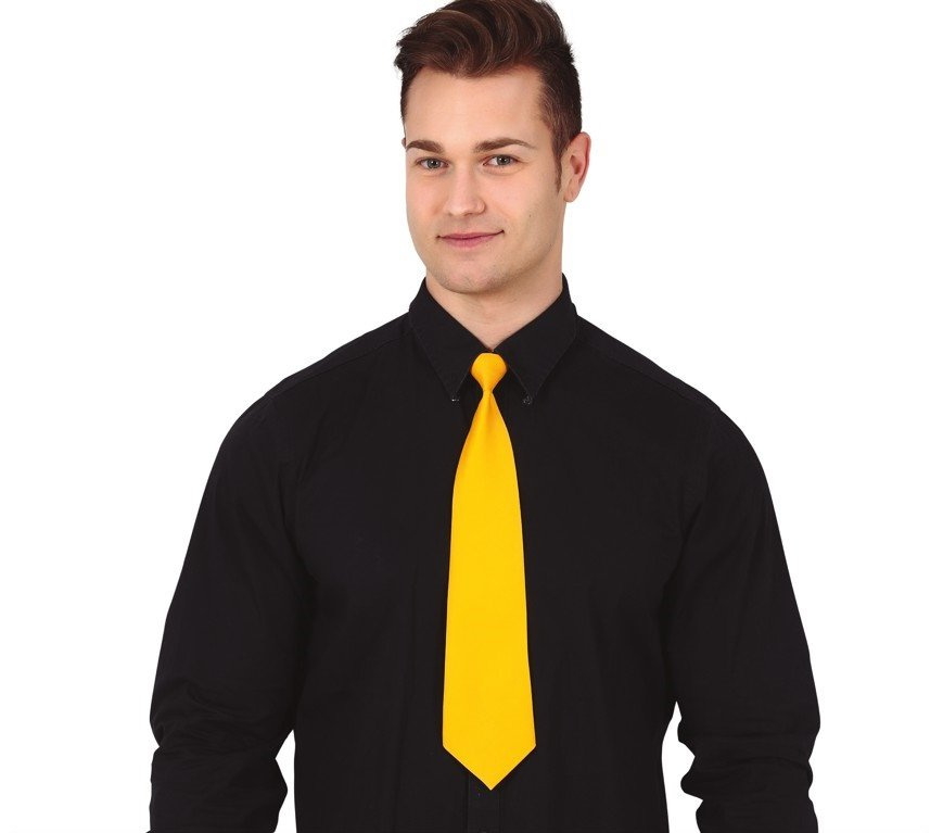 • Krawat wykonany jest z materiału w żółtym kolorze. Gładki - bez nadruku. Krawat mocowany jest na gumce, nie ma możliwości regulacji długości.