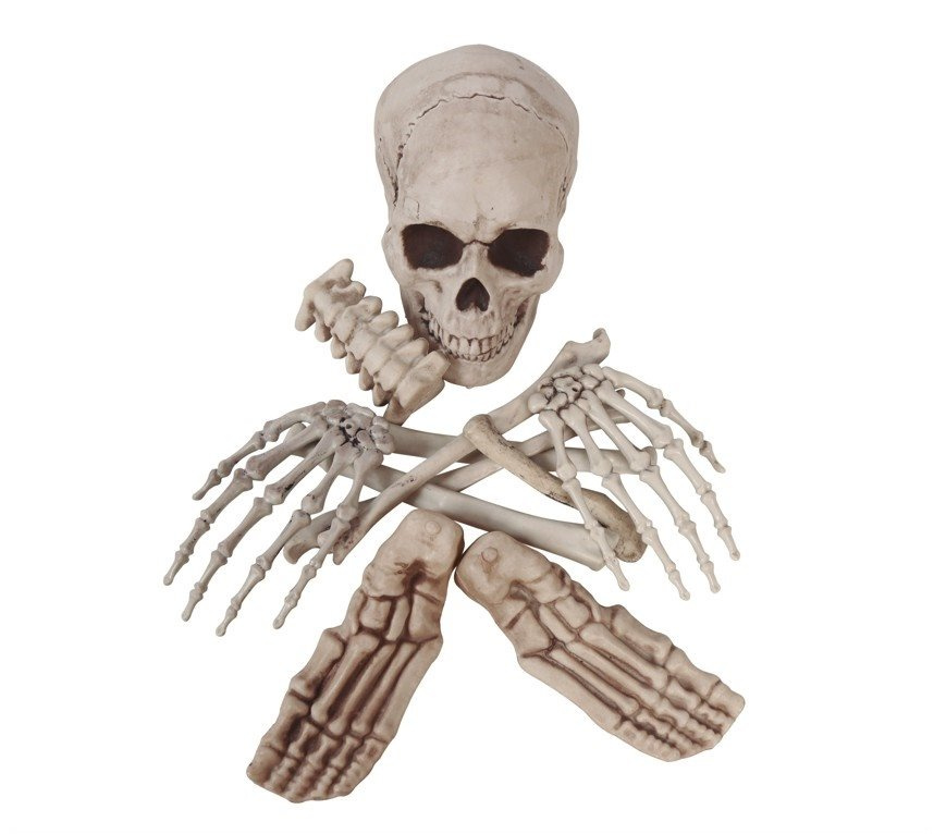 - Zestaw zawiera czaszkę, kości dłoni, stóp, fragment kręgosłupa oraz 6 kości prostych (łącznie 12 elementów). Dekoracja wykonana z plastiku.