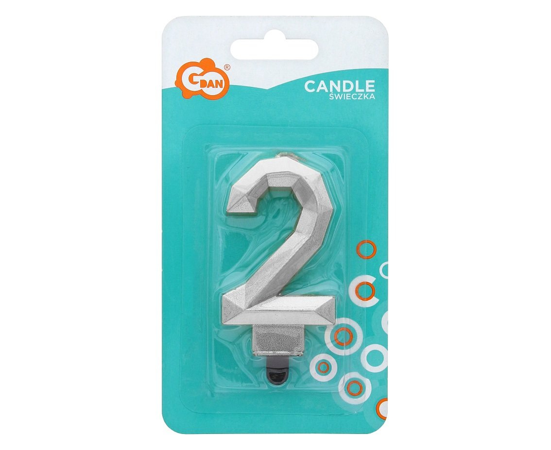 Świeczka w kształcie cyfry 2 pokryta jest metalizowaną farbą w połyskującym, srebrnym kolorze. Świeczka ma kanciasty kształt, jak oszlifowany diament. Mocowana jest na torcie urodzinowym lub rocznicowym na przymocowanej, plastikowej podstawce. Skompletowana z innymi cyframi tworzy dowolny numer.