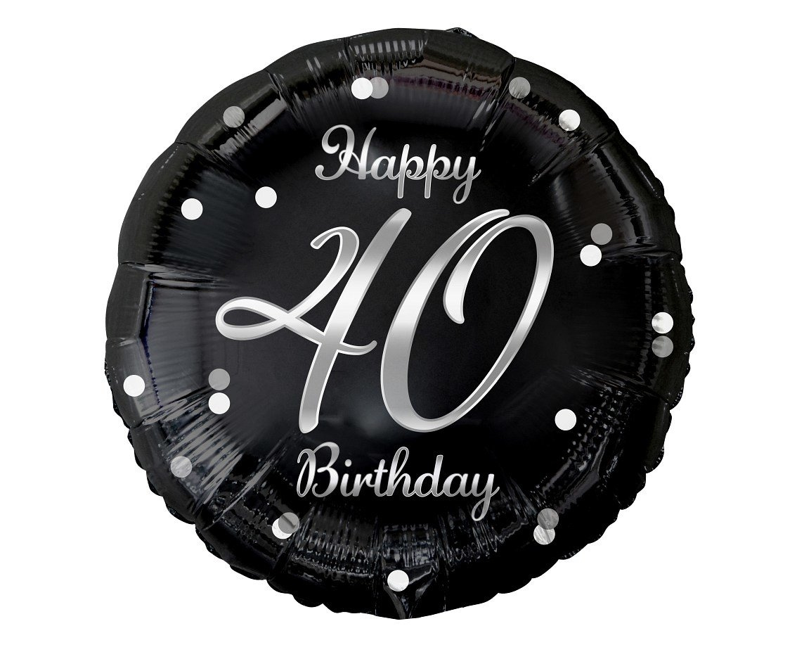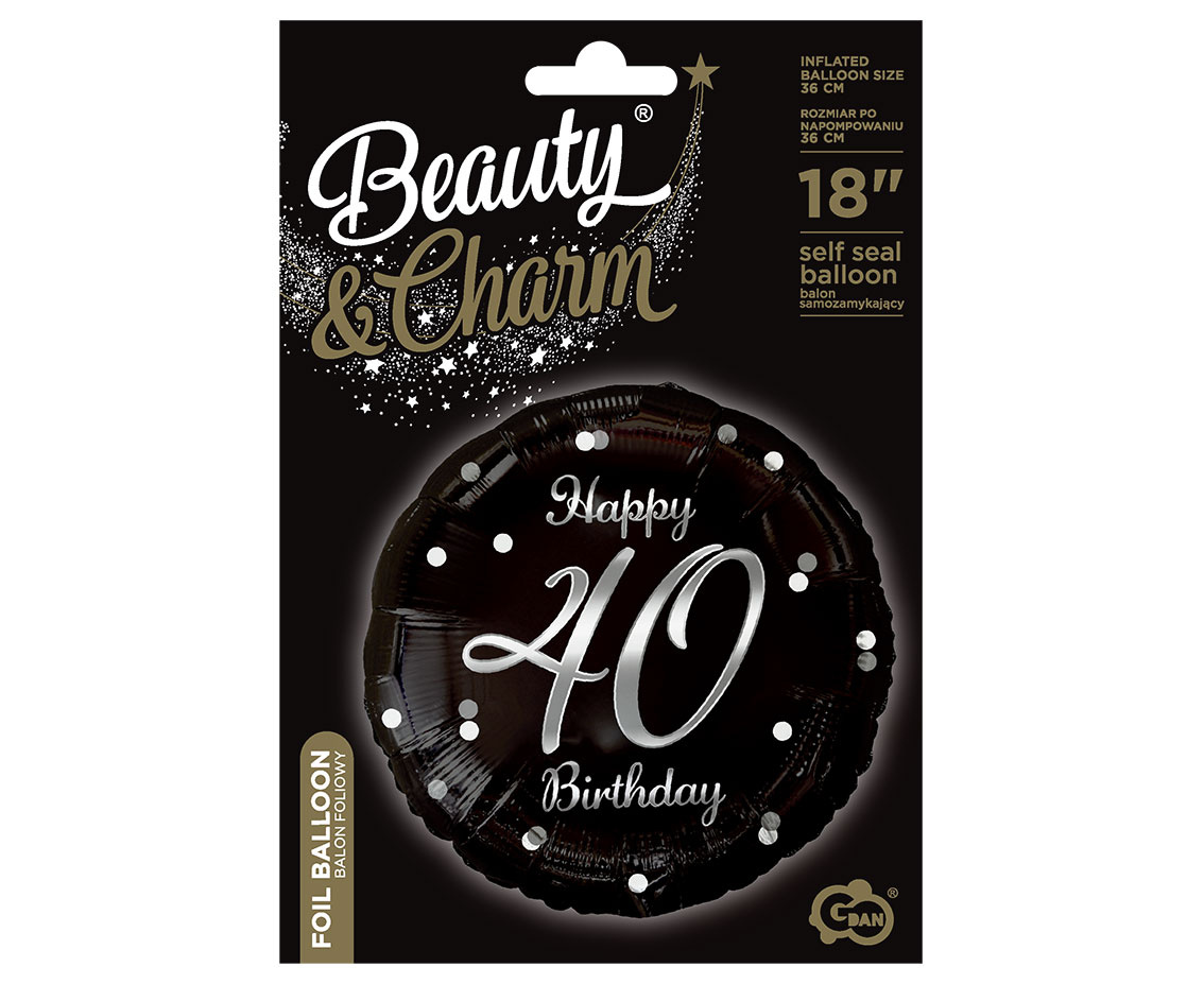 • Czarny balon o średnicy 45 cm ze srebrnym nadrukiem numeru 40 oraz napisem "happy birthday". Oryginalna i niepowtarzalna dekoracja na 40-te urodziny. Super także jako prezent.