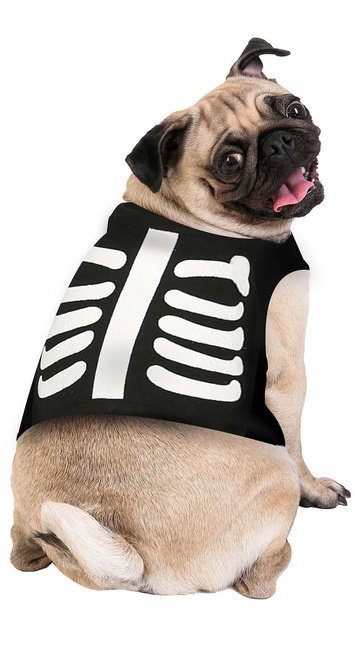 - Kostium szkieleciku dla pupila, idealny na halloweenowy spacer. Przebranie składa się z kamizelki. Na pleckach naklejki tworzące obraz kości kręgosłupa i żeber. Przebranie zapinane na rzepy, wykonane z miękkiego materiału.