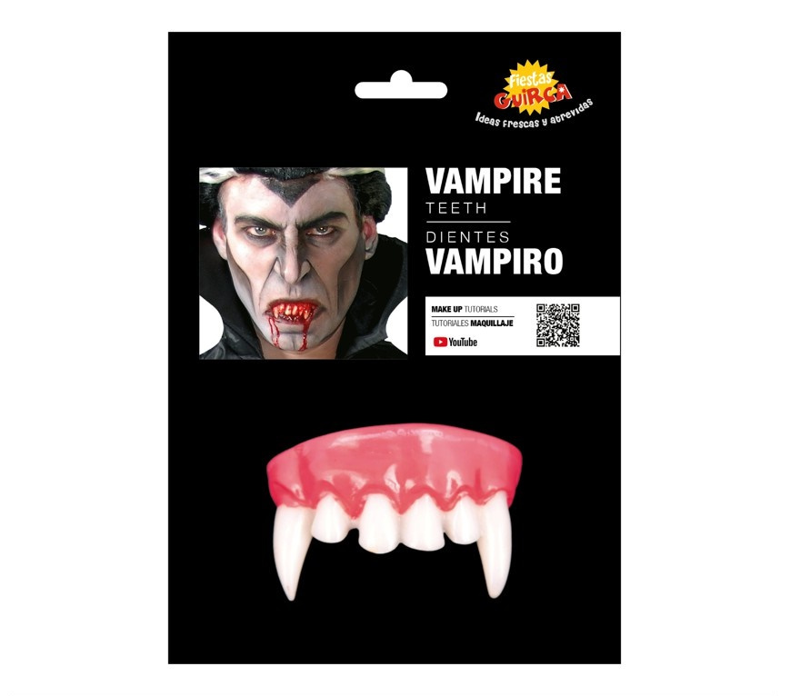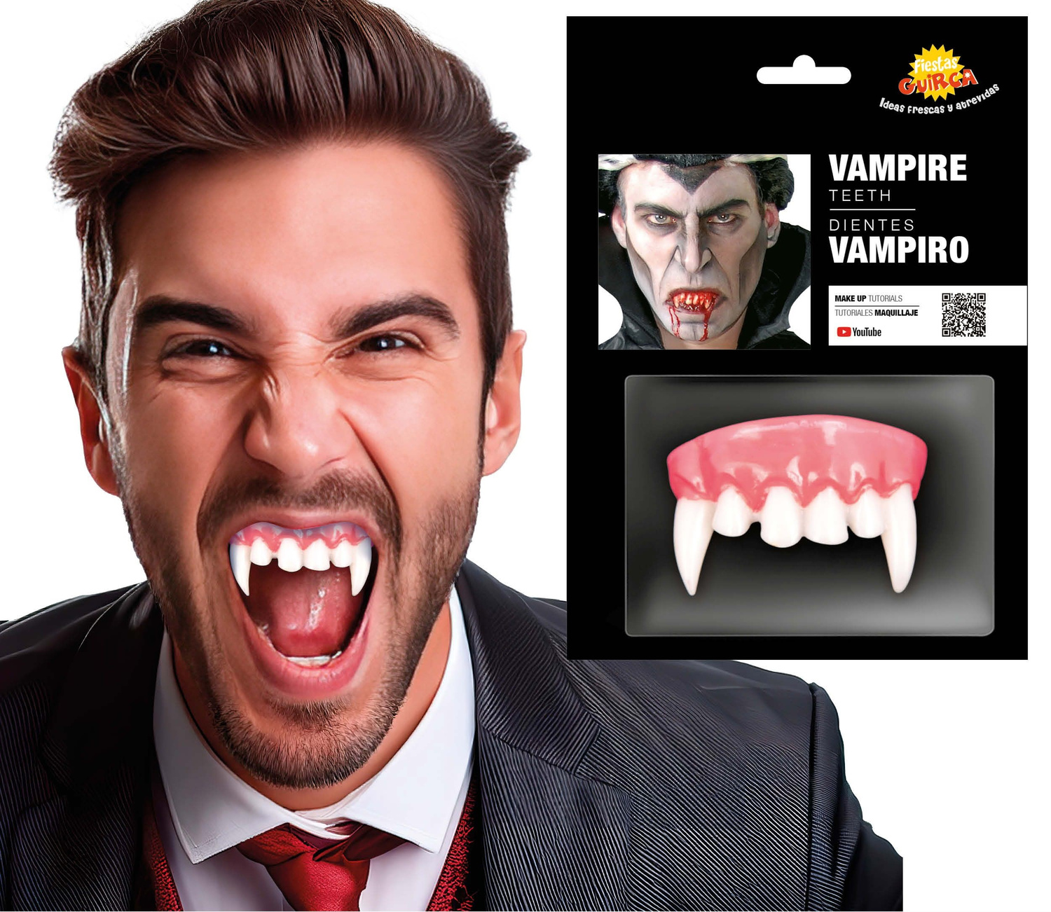Sztuczna szczęka z wystającymi kłami to niezbędny dodatek do przebrania wampira. Szczęka składa się z górnej nakładki na zęby z białymi krzywymi zębami oraz linią dziąseł. Nakładka jest w naturalnych kolorach z 4 białymi dużymi i krzywymi zębami oraz 2 wystającymi kłami. Produkt wykonany z miękkiego tworzywa. Okropne, przerażające zęby - to świetny gadżet jeśli chcesz zrobić komuś psikusa, doskonały dodatek do kostiumu na Halloween i w karnawale.