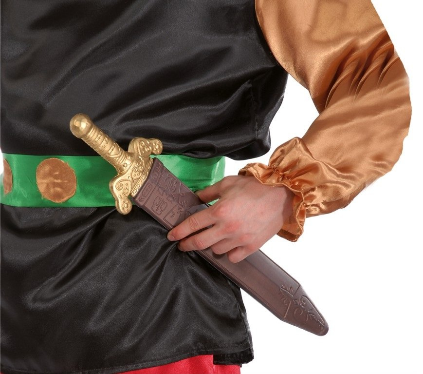Miecz wykonany z plastiku. Szabla ze złotą rączką oraz złotym, matowym "ostrzem". Półokrągło zakończone, dla większego bezpieczeństwa. Na uchwycie oraz szabli, wytłoczenia imitujące wykłute w stali wzory. Znakomite uzupełnienie kostiumu rycerza, gladiatora, Spartanina, Rzymianina lub innego wojownika, nawet wikinga. Zestaw uzupełnia brązowa pochwa, wsuwana na ostrze.
