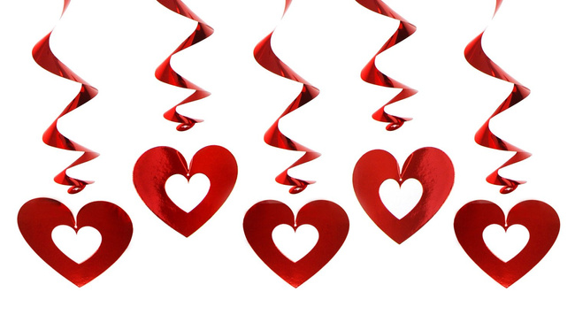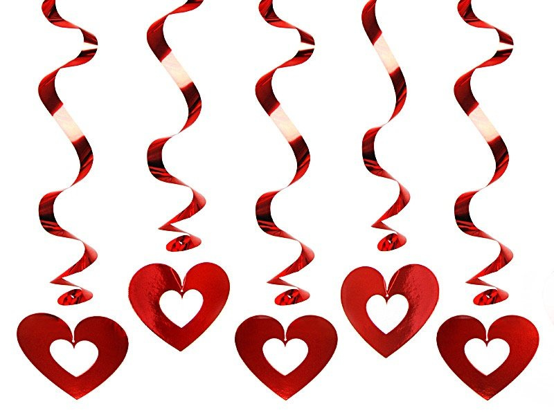 Czerwone świderki wykonane z tworzywa. Na każdym kręciołku znajduje się zawieszka w kształcie serduszka z otworem po środku. Świderki pozwolą stworzyć piękną, romantyczną dekorację Walentynkową lub ślubną. Kręciołki są niezależne od siebie i posiadają haczyk.
