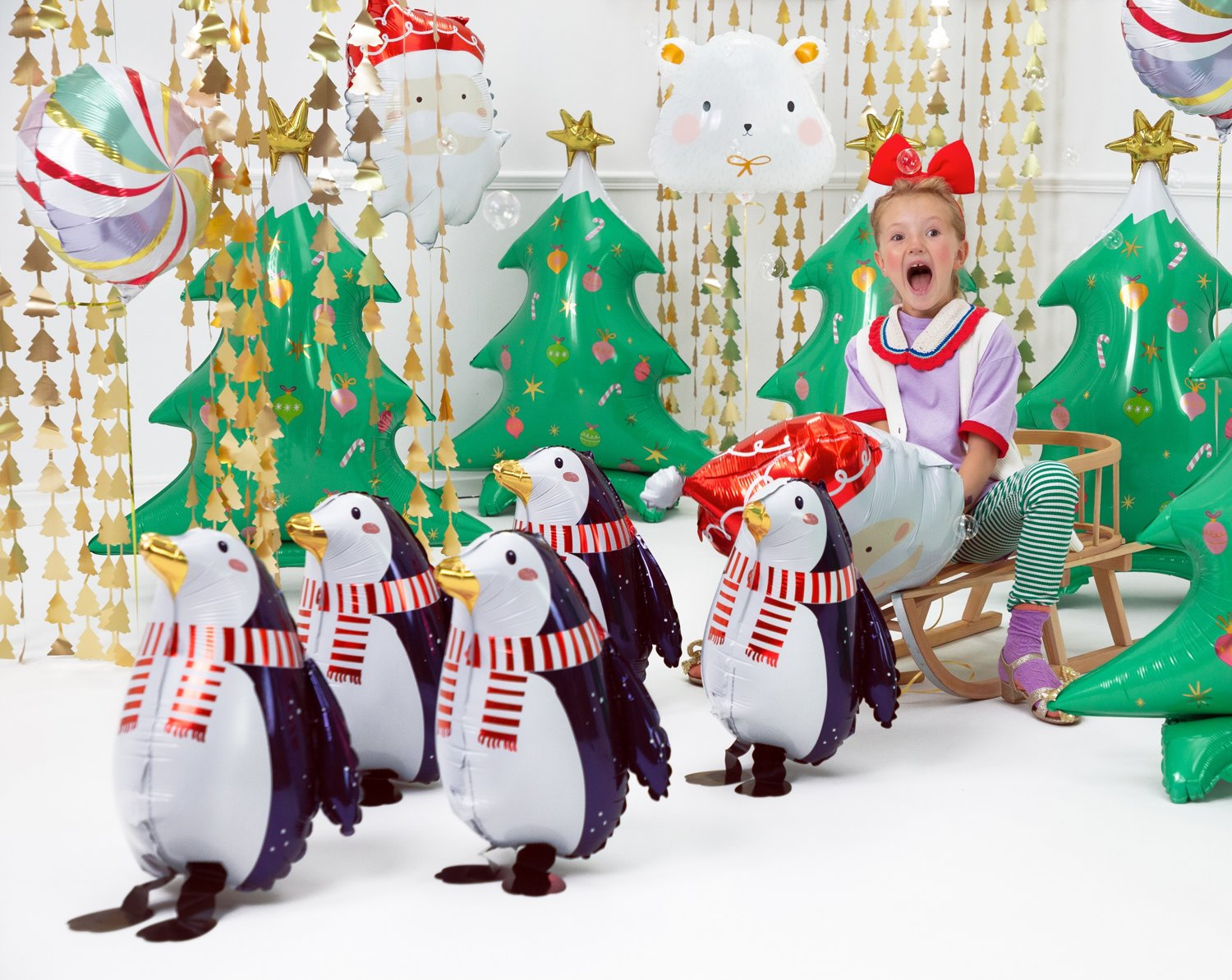 Duży balon z podstawką, wykonany z folii. Balon ma kształt choinki z nadrukiem kolorowych bombek. Na szczycie złota, połyskująca gwiazdka. Podstawka jest częścią balonu, można ją dodatkowo przywiązać - posiada uchwyty. Balon posiada zawór samo zamykający dzięki któremu powietrze nie ulatuje i nie trzeba martwić się o wiązanie. Znakomita dekoracja na świąteczny czas, bez obawy o opadające igły.