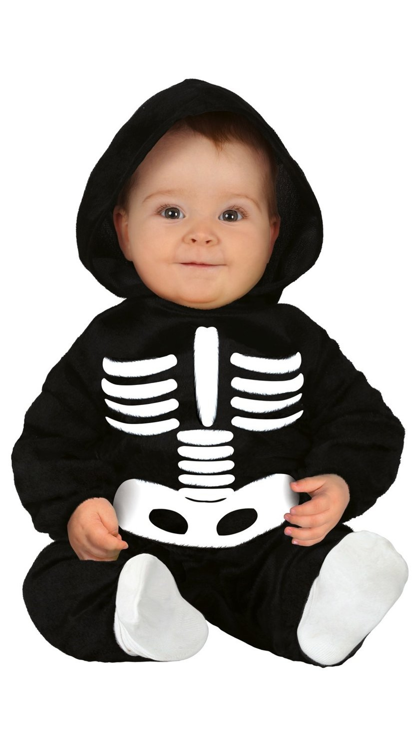 Czarny kombinezon jednoczęściowy z długimi rękawami i nogawkami. Przebranie posiada kaptur na styl kigurumi. Na torsie oraz brzuszku nadruk białych kości (żeber i miednicy). Z tyłu zapięcie na rzep. Przebranie posiada rozpięcie w kroku i nogawkach na rzep, co ułatwia zmianę pieluszki, bez potrzeby ściągania całości. Całość z bardzo miękkiego i miłe w dotyku materiału. Idealne przebranie szkieletu, kościotrupa czy zombie na Halloween oraz horror party.