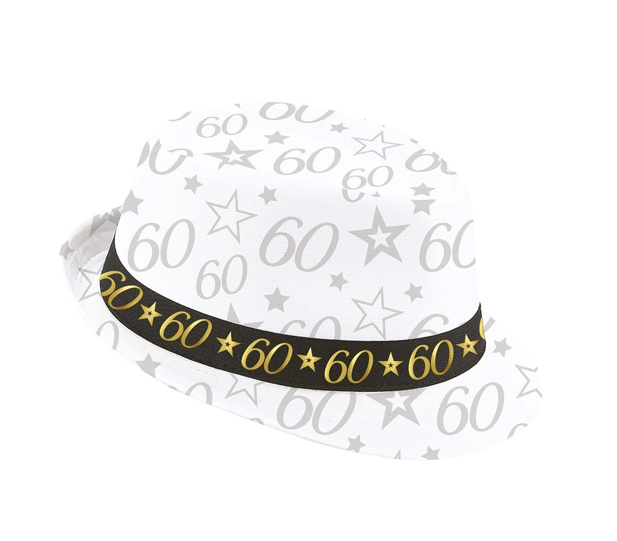 Biały kapelusz wykonany jest z usztywnionego materiału. Na całości nadruk wielu cyfr 60 oraz gwiazdek w szarym kolorze. Rondo zdobi czarna tasiemka ze złotym nadrukiem numerów 60, które przedzielone są także gwiazdami. Doskonały dodatek dla jubilata, aby podkreślić kolejny etap życia.