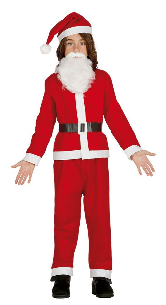 W zestawie czerwona bluzka z długim rękawem, z przodu w większości zszyta, zapinana pod szyją na rzep. Bluza posiada białe wykończenia z materiału przy kołnierzu, mankietach, na froncie oraz na dole stroju. Uszyta z miękkiego materiału, od tyłu w pasie posiada wszytą gumkę, dla lepszego dopasowania do figury. Do bluzki dopięty jest czarny pas z białą, plastikową klamrą. Strój uzupełniają czerwone spodnie, ze sznurkiem w pasie, który można dostosować do obwodu. Spodnie mają nogawki wykończone białym materiałem. Dopełnieniem kostiumu jest czapka Mikołaja z białym pomponem oraz broda z wąsami, mocowana na gumce.