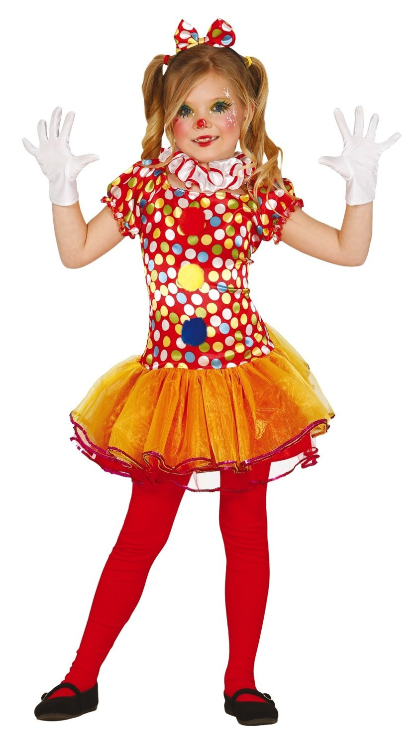 Czerwono - żółta sukienka dla dziewczynki klauna. Sukienka posiada krótki rękawek, zakończony falbanką. Bluzeczka sukienki wykonana z przodu z satynowego, połyskującego materiału w groszki, tył z elastycznego poliestru. Na przodzie kolorowe pomponiki, które imitują duże guziki. Spódnicę tworzą cztery falbany z różnych materiałów, dzięki czemu łatwiej osiągnąć objętość.