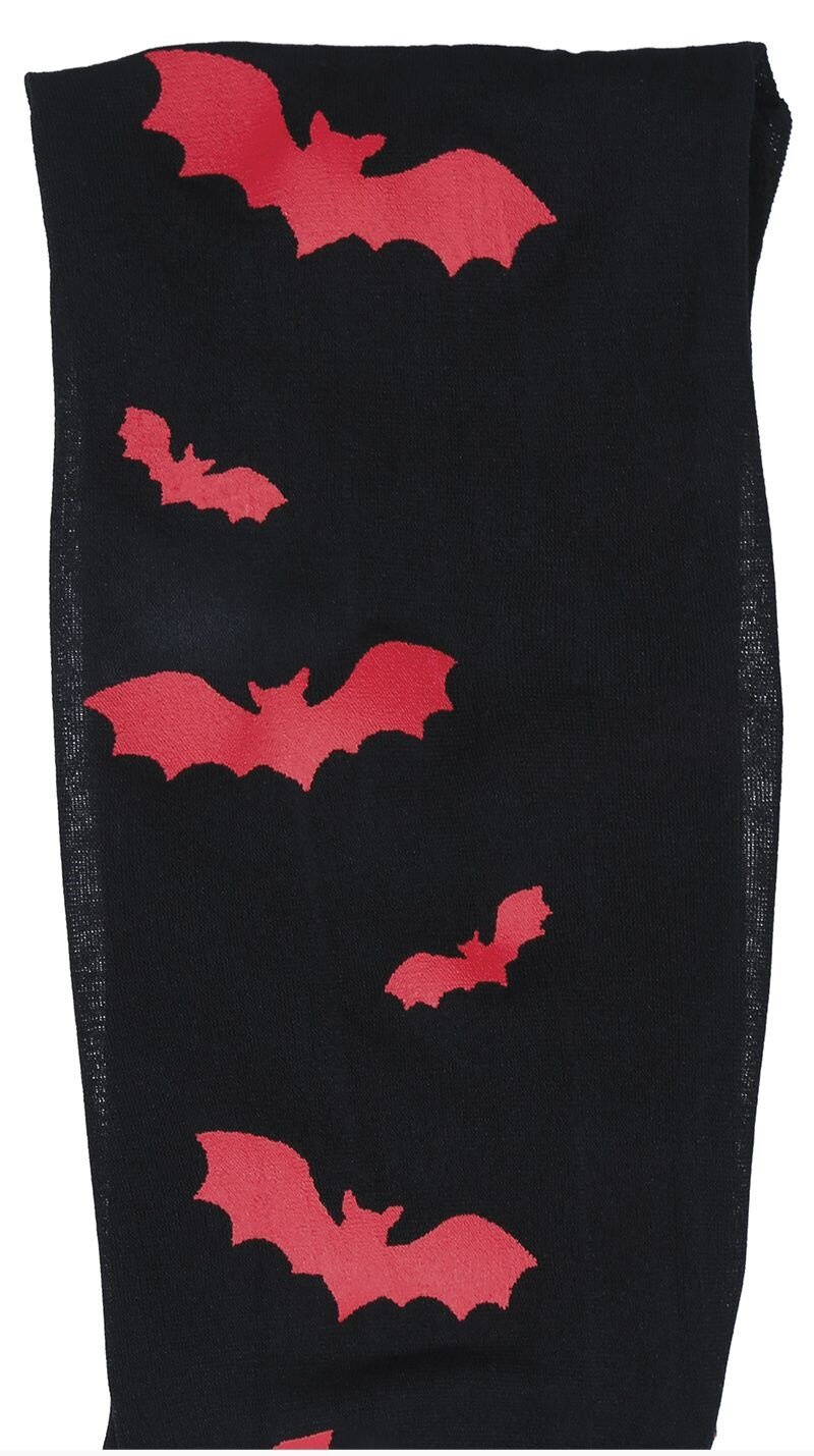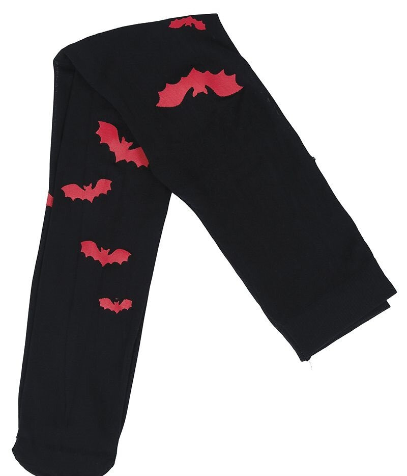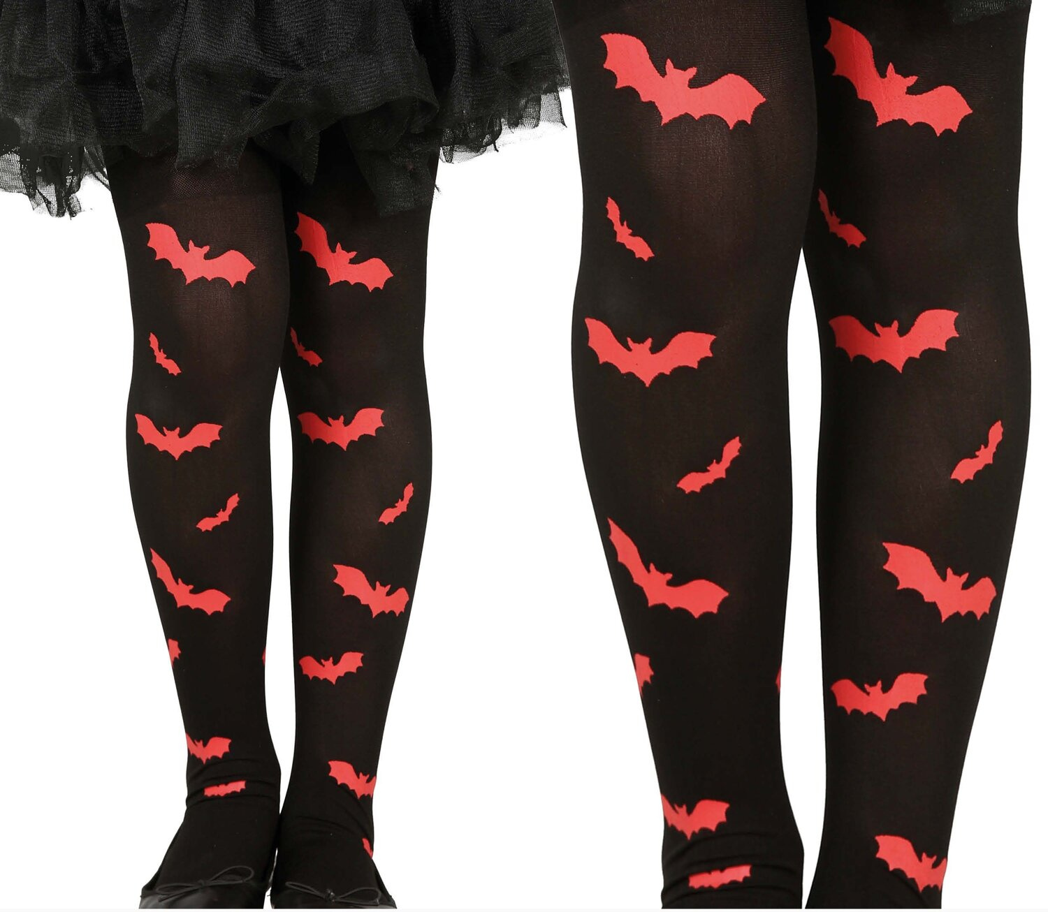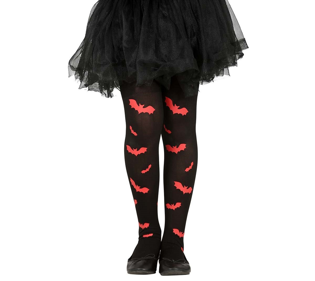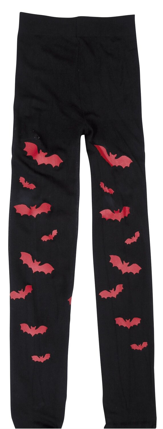- Rajstopy dziecięce czarne ze wzorkiem w czerwone nietoperze. Rajstopy mają nogawki zakończone przy palcach szwem. Nie posiadają klina ani stopki.