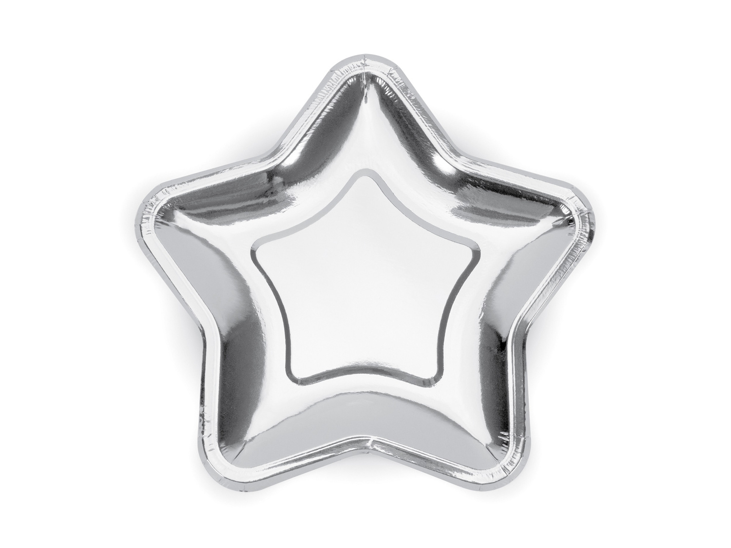 - Srebrne talerzyki papierowe w kształcie gwiazdki. Talerze połyskują dodając blasku na stole. Powierzchnia jest gładka, posiadają wgłębienie i biały spód. Idealne na każde przyjęcie do przekąsek, ciasteczek, tortu. Średnica: 23 cm