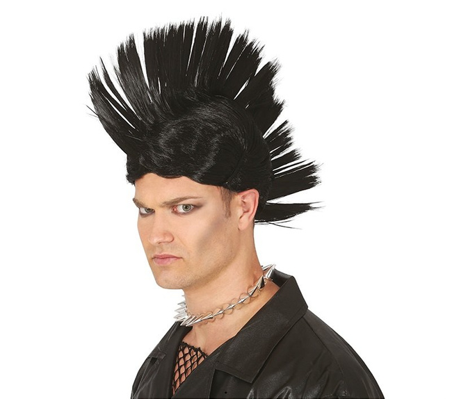 - Szalona peruka z fryzurą na irokeza. Boki wykonane są z krótkich włosów, przez środek przebiega pas czarnych wysoko postawionych włosów na 11 cm.