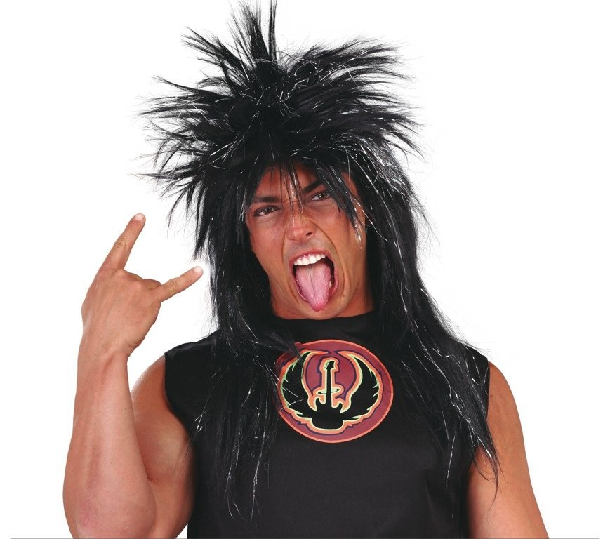 - Peruka w czarnym kolorze z prostymi włosami. Fryzura stylizowana na lata 80/90 w punkowym charakterze. Idealny dodatek na imprezę w rockowym klimacie.