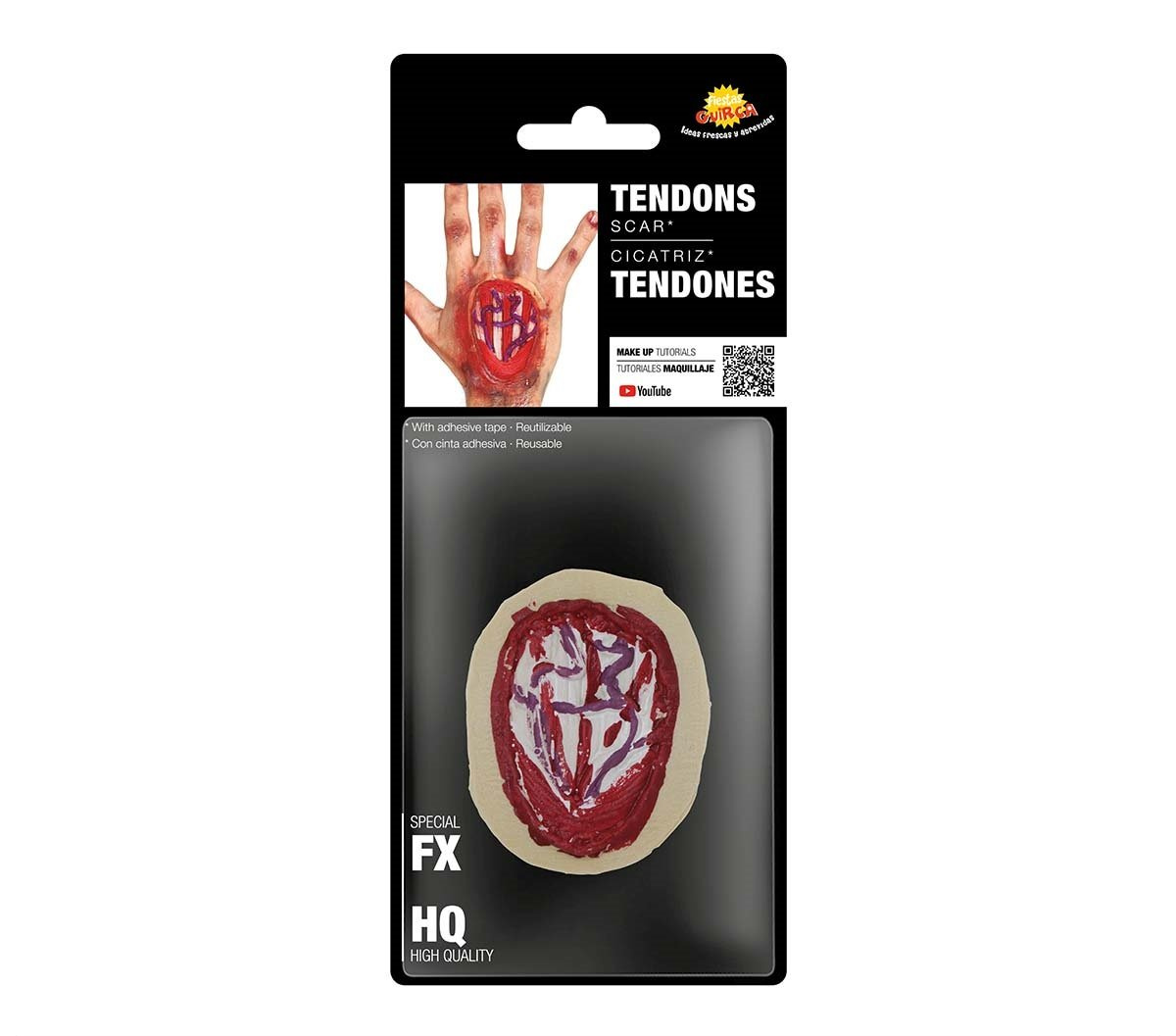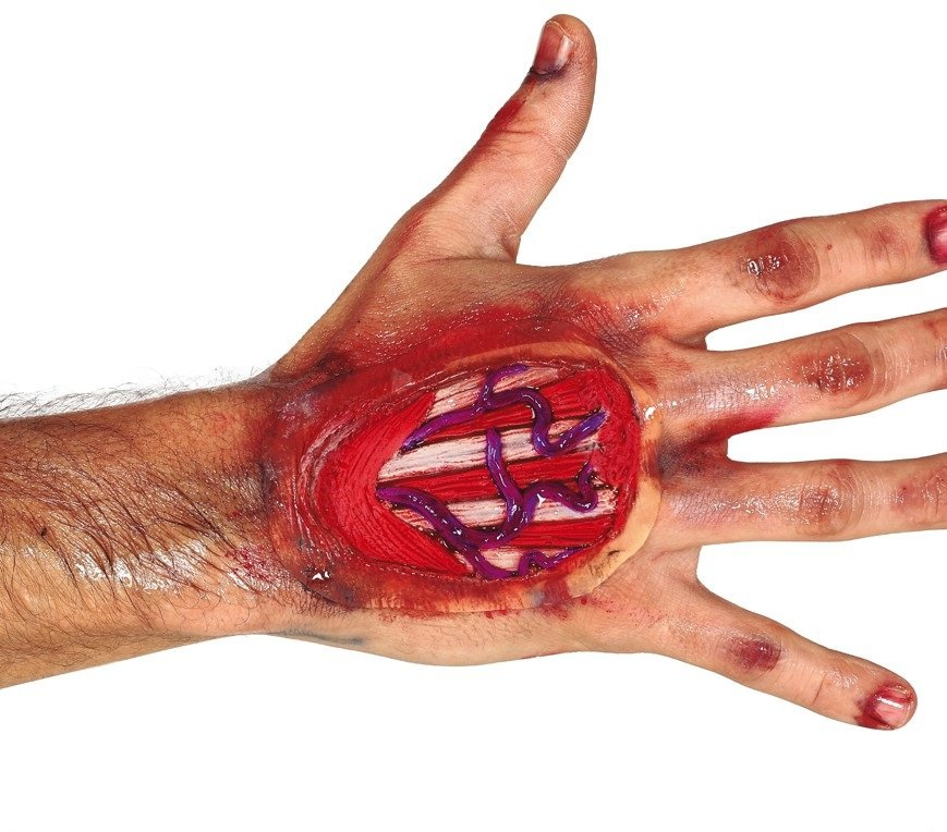 Blizna, jak rana z rozdartą skórą i tkanką mięśniową z której wystają kości i żyły. Ranę zaleca się umieścić na grzbiecie dłoni. Dla bardziej realistycznego wyglądu zaleca się użyć sztuczną krew lub wykonać odpowiedni makijaż. W komplecie dołączona jest taśma dwustronna do mocowania.