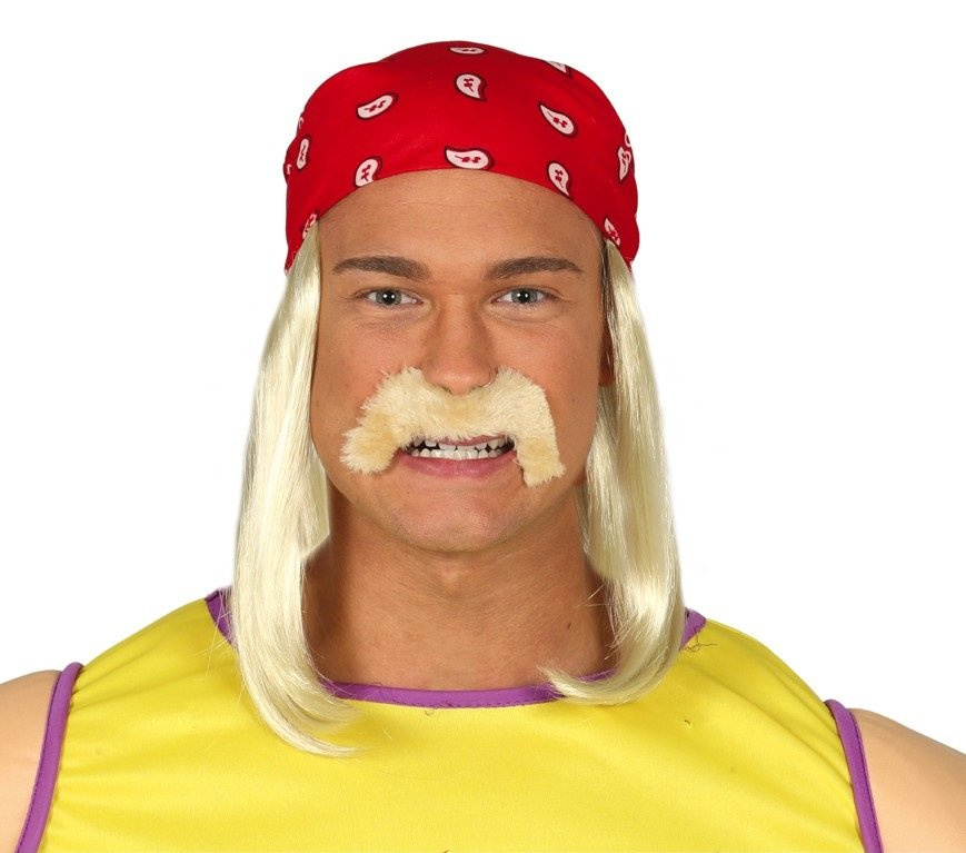 - Peruka w stylu wreslera, sprawdzi się także bez wąsów w charakteryzacji sierotki Marysi lub innej postaci z chustką na głowie. Włosy proste , blond przyczepione po dwóch stronach chusty. W zestawie blond zarost na materiałowej podszewce.