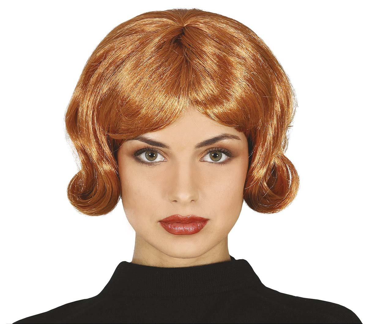 - Peruka z włosami sięgającymi za ucho. Włosy rude, podwinięte na końcach, posiada grzywkę zaczesaną na boki.