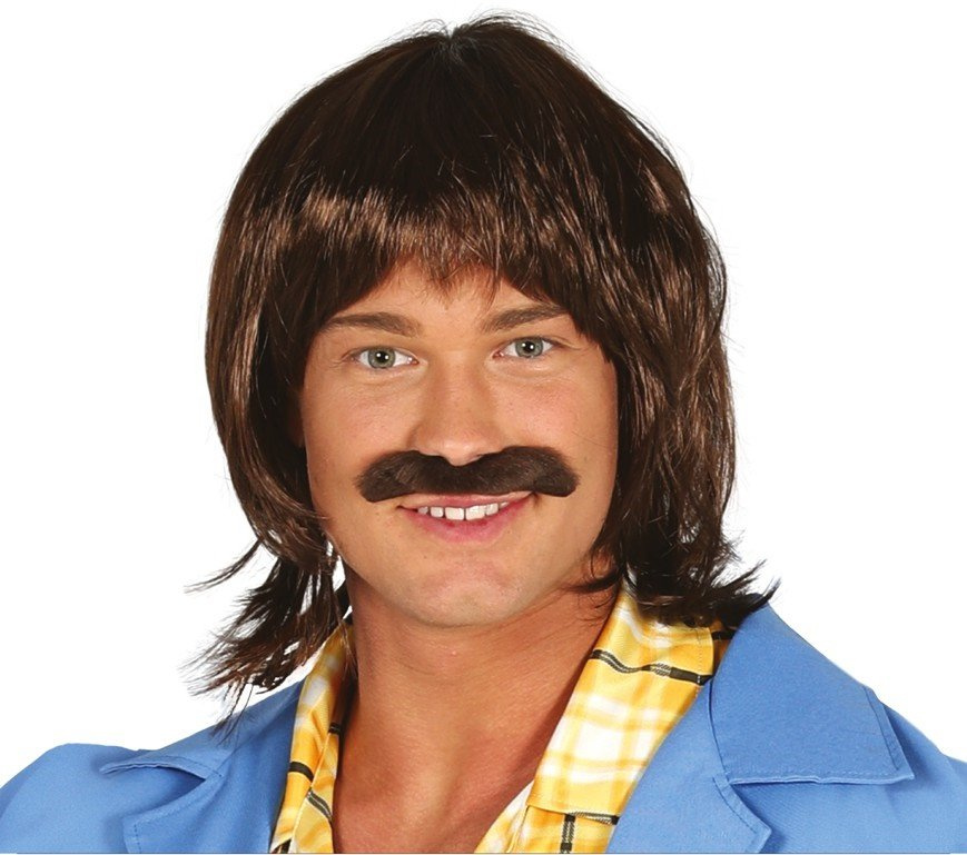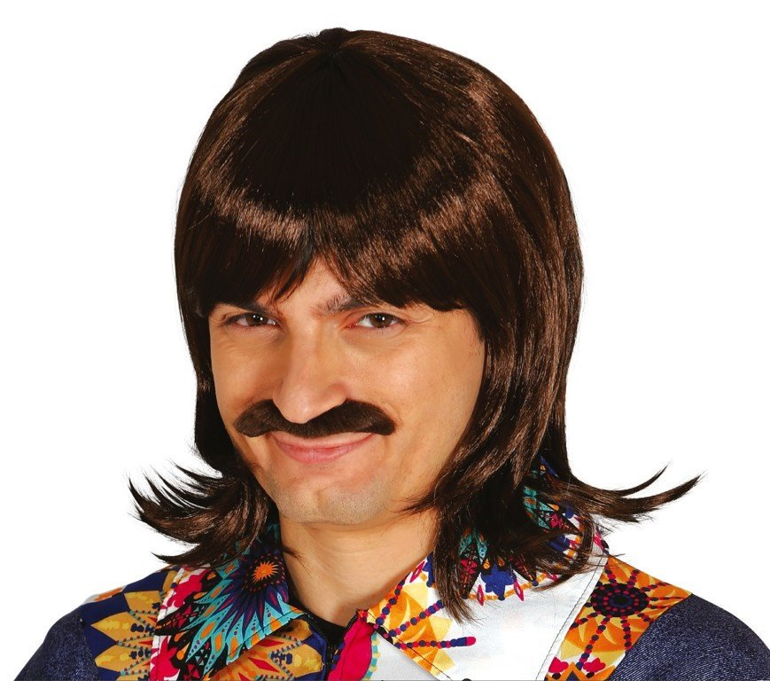 • Świetna peruka dla mężczyzny, krótka w kolorze kasztanowym. Idealny dodatek do przebrania w stylu lat 70-tych, Hippisi, dzieci kwiaty lub filmowej postaci - Kudłaty ze Scooby Doo. W zestawie z wąsami, także w brązowym kolorze. Mocowane na taśmę.