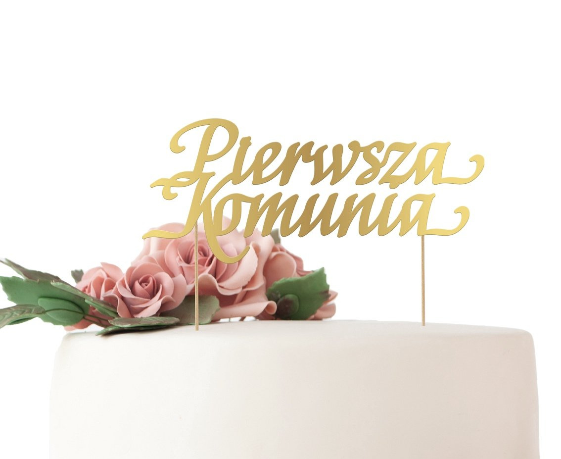 • Dekoracja na drewnianych pikerach (patyczkach) z napisem Pierwsza Komunia. Topper ma wysokość ok. 213,5cm. Napis ozdobiony lustrzaną folią. Znakomita dekoracja tortu, wypieków, bufetu na przyjęciu komunijnym.