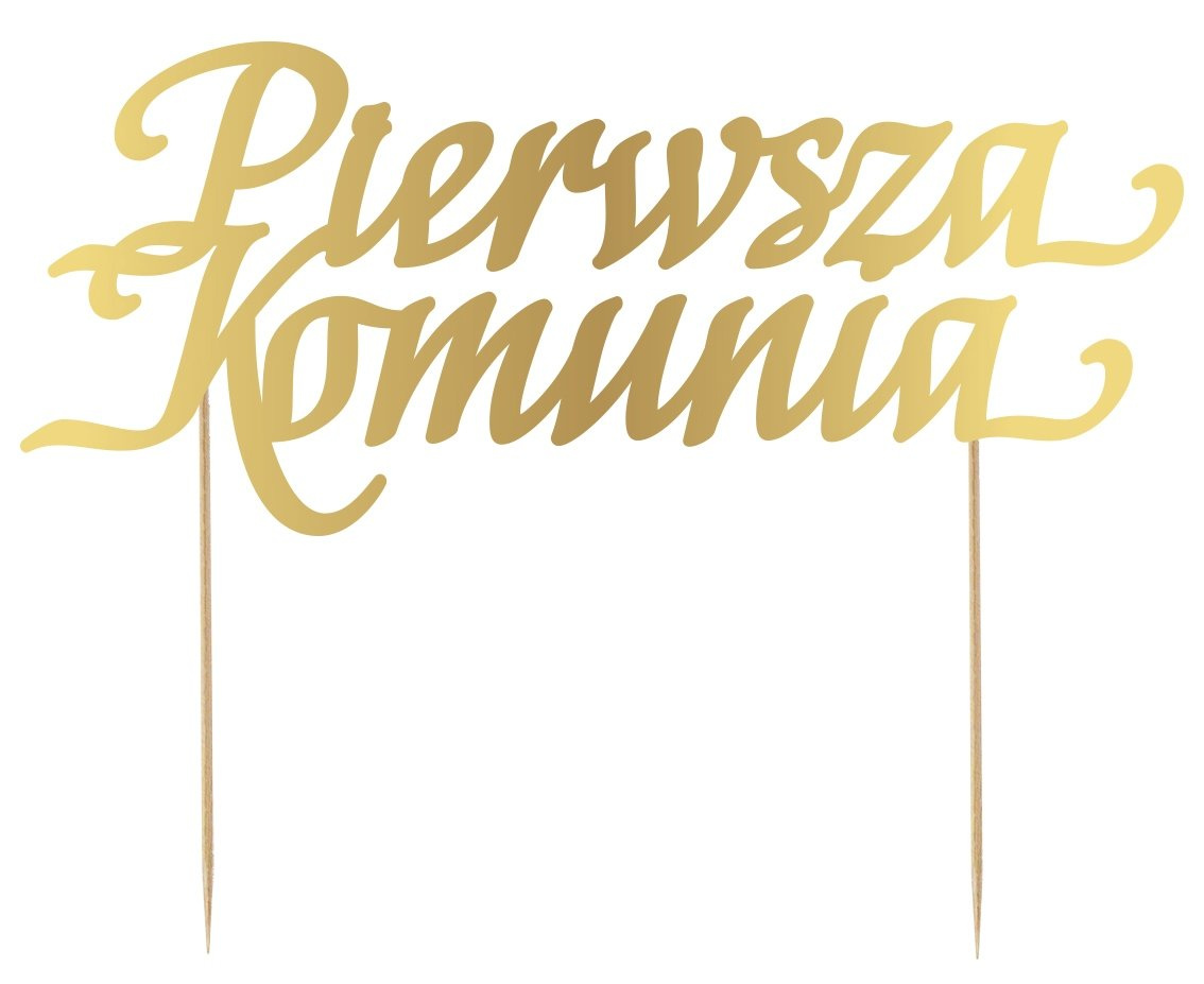 Elegancka dekoracja wykonana z tektury, mocowana na dwóch drewnianych pikerach (patyczkach). Po przodu pokryta złotą, lustrzaną folią. Tworzy napis: Pierwsza Komunia. Tył gładki, biały.