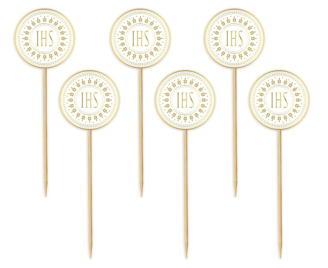 Okrągłe tekturki ze złotym, połyskującym nadrukiem IHS. Napis otacza ornament nawiązujący do hostii. Nadruk jednostronny lustrzany, tył biały. W zestawie z drewnianymi patyczkami o długości 10 cm. Pickery gotowe do użycia.