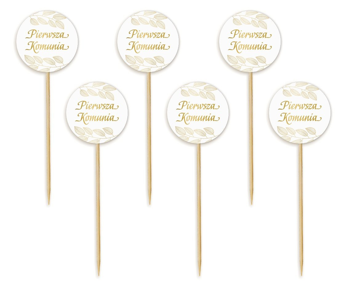 Okrągłe tekturki ze złotym, połyskującym nadrukiem napisu Pierwsza Komunia. Napis otacza delikatny wzór listków. Nadruk jednostronny lustrzany, tył biały. W zestawie z drewnianymi patyczkami o długości 10 cm. Pickery gotowe do użycia.