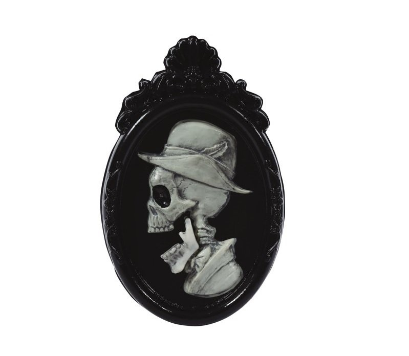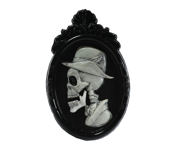 Dekoracja do powieszenia na Halloween. Obraz w dekoracyjnej ramie ma formę płaskorzeźby w kształcie popiersia z czaszką. Wykonany z plastiku. Dekoracja posiada mechanizm zasilany na baterie. Po włączeniu uaktywnia się lampka LED w oczach (miga na czerwono), czacha porusza żuchwą oraz mechanizm wydaje dźwięk szczękania zębami.