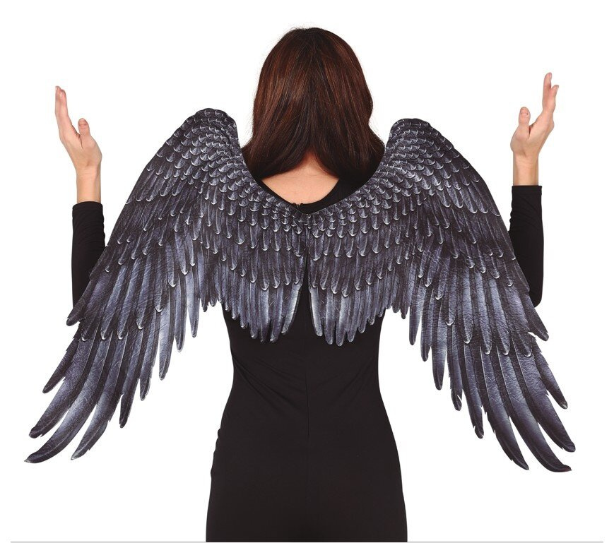 Skrzydła pokryte aksamitnym materiałem, który posiada nadruk czarnych i grafitowych piór. Wzór jest dwustronny, od zewnątrz z połyskiem, od spodu matowy. Skrzydła mocowane są na gumkach - zakładane jak plecak. Doskonałe uzupełnienie stroju anioła, archanioła, ptaka.