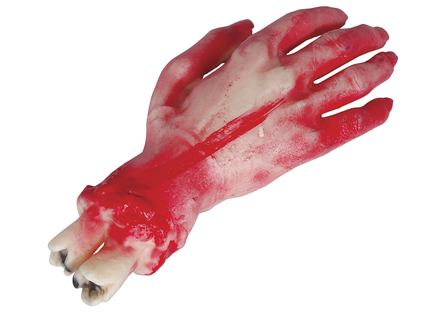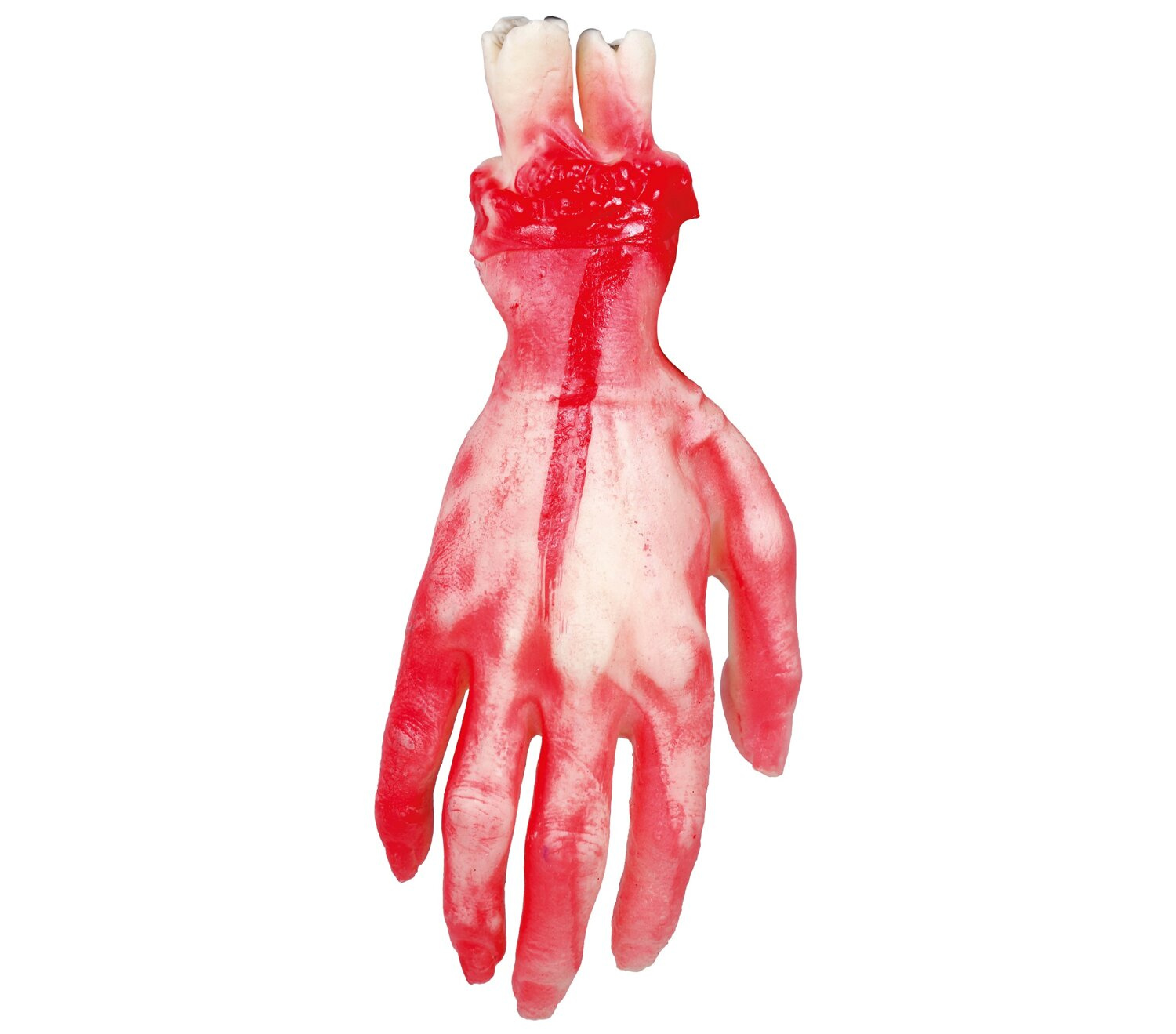 Sztuczna, ucięta ludzka prawa dłoń. Idealna do charakteryzacji na Halloween lub jako element dekoracji. Kończyna wykonana z miękkiej gumy, ubrudzona sztuczną krwią. Na końcu dłoni wystają dwie krótkie kości.