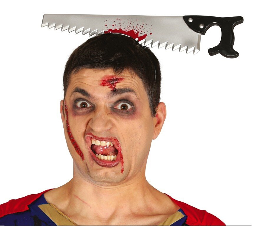 Plastikowa opaska do włosów w czarnym kolorze. Do opaski przyczepia się piłę ubrudzoną sztuczną krwią. Narzędzie jest jednostronne (nadruk z jednej strony, tył pusty). Znakomita do charakteryzacji halloweenowej, wygląda jak wypadek przy pracy.
