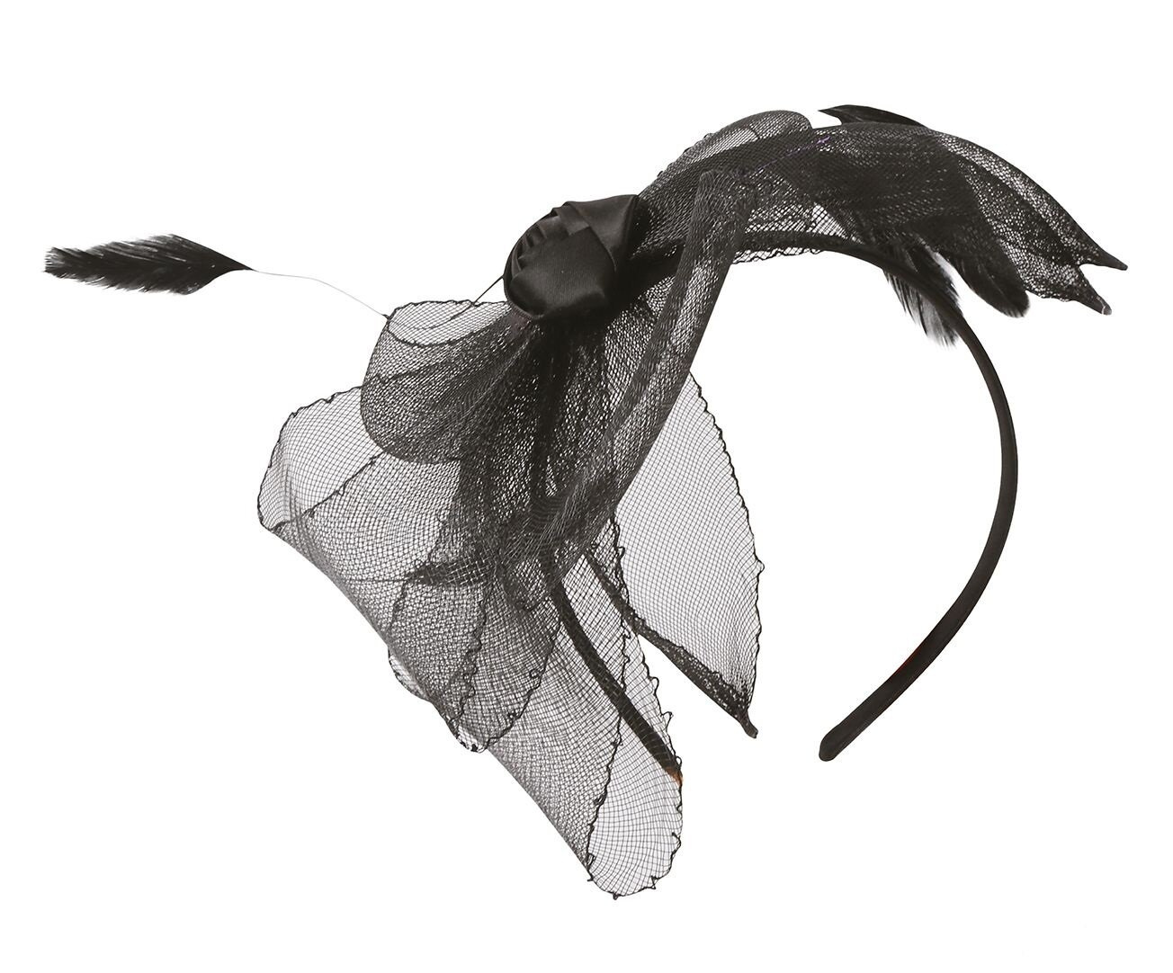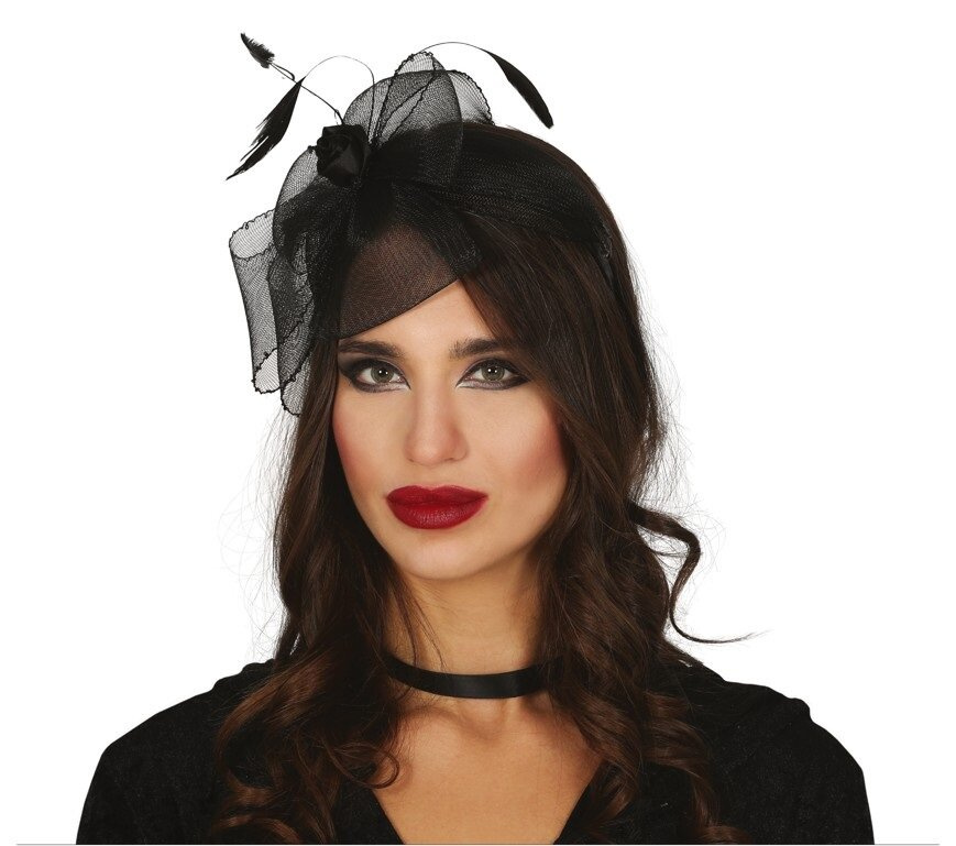 Plastikowa opaska pokryta czarnym materiałem z satyny. Na szczycie doczepiona jest ażurowa kokarda z kwiatem i piórkami. Wszystko w kolorze czarnym. Doskonałe dopełnienie stroju brytyjskiej arystokratki, damy lat 20-tych lub wdowy np. na Halloween.