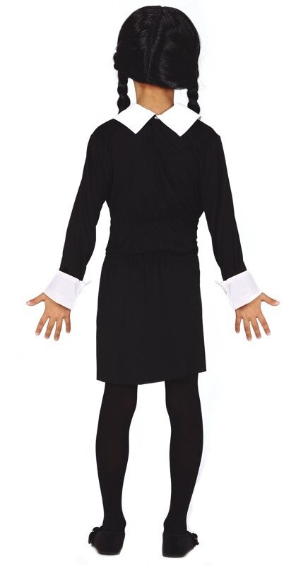 Strój Thursday to jednoczęściowa sukienka w czarnym kolorze. Sukienka posiada biały kołnierzyk oraz białe mankiety przy długich rękawach. Z tyłu w pasie gumka dla lepszego dopasowania do figury. Sukienka bardzo klasyczna sprawdzi się w charakteryzacji filmowej Wednesday Addams, uczennicy lub młodej czarownicy.
