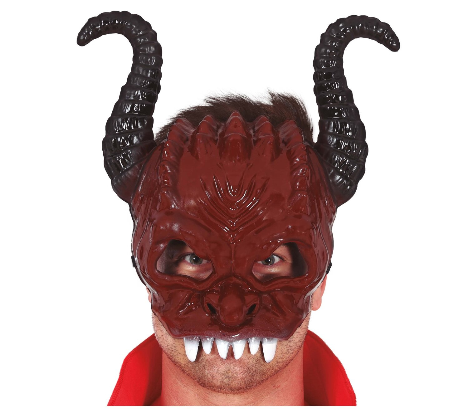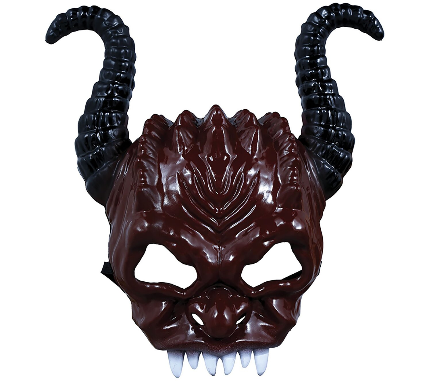 Maska zakrywająca pół twarzy wykonana z plastiku. Wyprofilowana, tworzy łeb potwora z rogami i upiornymi zębami. Wybarwiona w czerwono - bordowym kolorze z czarnymi rogami. Mocowana na gumce. Sprawdzi się w charakteryzacji demona, diabła lub mitologicznego Minotaura.