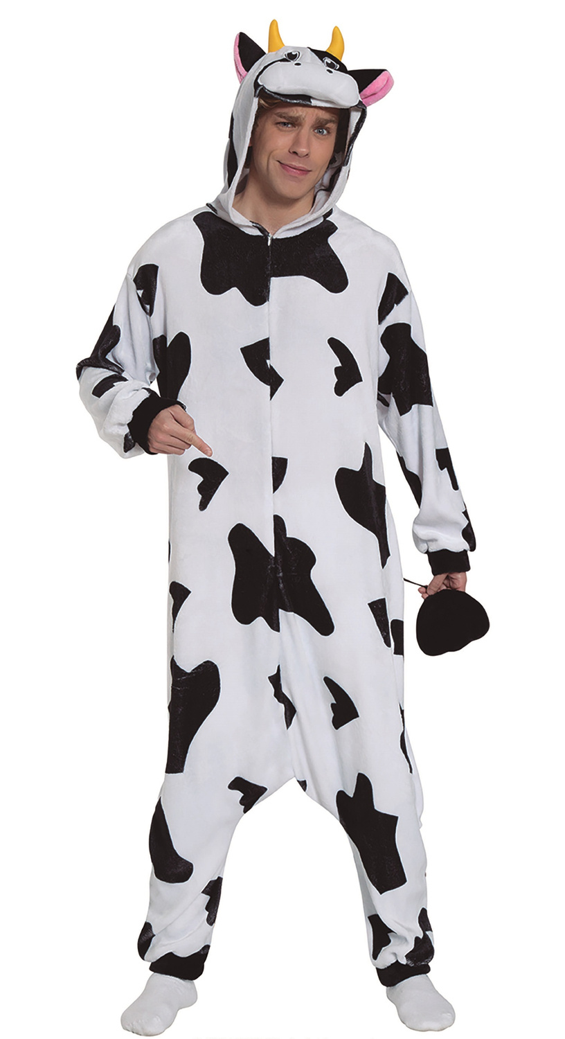- Kostium dojnej krowy w biało - czarne łaty. Przebranie składa się z kombinezonu z kapturem, kostium zapinany jest na suwak.